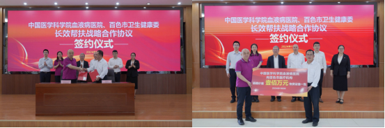 為更好實(shí)現(xiàn)長(zhǎng)期幫扶,所院與百色市衛(wèi)生健康委本著“資源共享、優(yōu)勢(shì)互補(bǔ)、互惠互利、共同發(fā)展”的原則簽訂戰(zhàn)略合作協(xié)議,并向百色市醫(yī)療機(jī)構(gòu)捐贈(zèng)價(jià)值100萬(wàn)元的藥品及遠(yuǎn)程醫(yī)療設(shè)備等物資,旨在進(jìn)一步提升百色市診療服務(wù)能力,助力血液病技術(shù)人才培養(yǎng),最大限度緩解當(dāng)?shù)鼐歪t(yī)難問題,百色市衛(wèi)生健康委黨組書記、主任黃再波代表百色市衛(wèi)生健康委簽約。