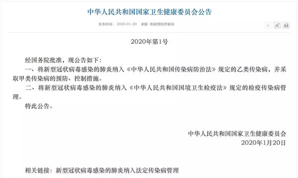 國家衛(wèi)健委發(fā)布1號公告,將新型冠狀病毒感染的肺炎納入《中華人民共和國傳染病防治法》規(guī)定的乙類傳染病,并采取甲類傳染病的預防、控制措施。將新型冠狀病毒感染的肺炎納入《中華人民共和國國境衛(wèi)生檢疫法》規(guī)定的檢疫傳染病管理。