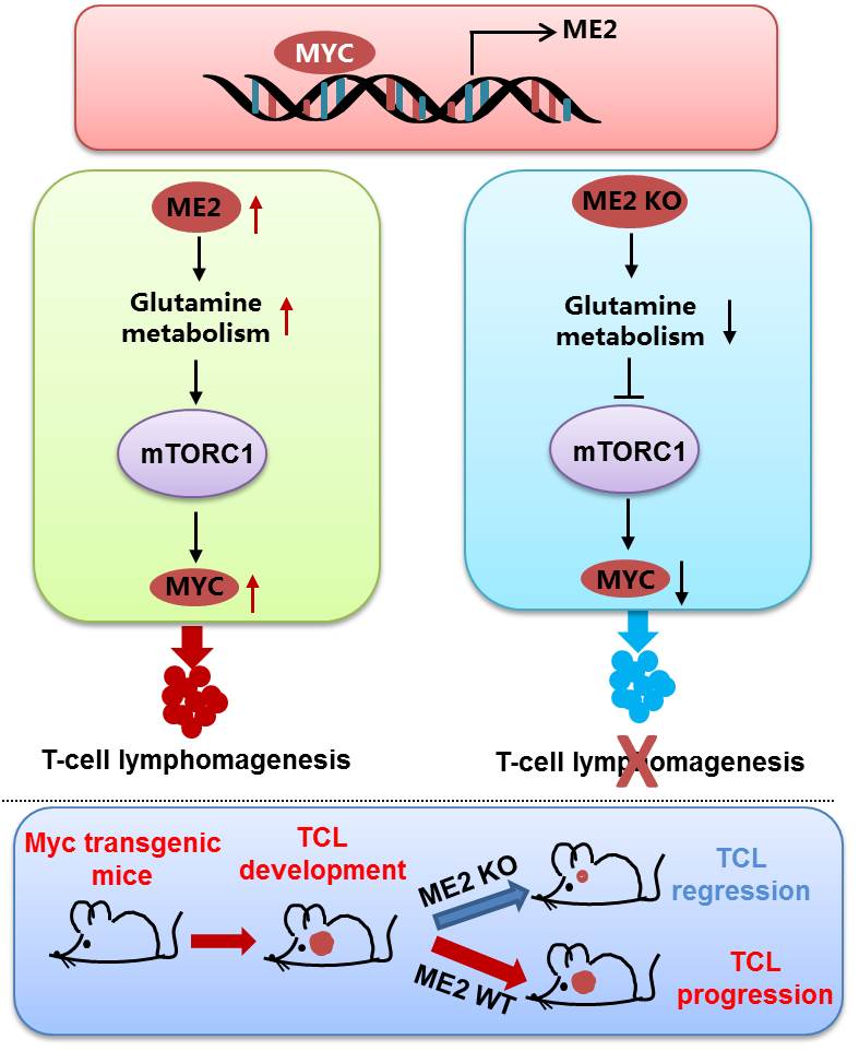T細(xì)胞淋巴瘤(TCL)是一組罕見(jiàn)的、高異質(zhì)性的腫瘤。盡管原癌基因MYC在驅(qū)動(dòng)T細(xì)胞淋巴瘤發(fā)生方面有重要作用,然而,目前仍不清楚MYC是如何發(fā)揮作用促進(jìn)T細(xì)胞淋巴瘤發(fā)生的。蘋(píng)果酸酶是依賴(lài)NADP+(NAD+)的酶,它通過(guò)將蘋(píng)果酸氧化成丙酮酸和NADPH(NADH),連接了谷氨酰胺代謝和葡萄糖代謝。在該研究工作中,本研究團(tuán)隊(duì)首先發(fā)現(xiàn)蘋(píng)果酸酶2(ME2)在多數(shù)T細(xì)胞淋巴瘤(TCL)細(xì)胞系以及組織中呈現(xiàn)特異性高表達(dá)的現(xiàn)象。通過(guò)在CD4啟動(dòng)子的控制下在T細(xì)胞中過(guò)量表達(dá)MYC建立了T細(xì)胞淋巴瘤小鼠模型(CD4-Cre;Mycfl/+mice),發(fā)現(xiàn)大約90%的小鼠發(fā)生TCL,同時(shí)也呈現(xiàn)ME2上調(diào)表達(dá)的現(xiàn)象。有趣的是,在該轉(zhuǎn)基因小鼠中敲除ME2幾乎完全抑制了小鼠TCL的發(fā)生,說(shuō)明ME2在MYC驅(qū)使的TCL中具有重要作用。為了弄清楚ME2在MYC驅(qū)動(dòng)的TCL中的作用,研究人員分別進(jìn)行了體內(nèi)及體外的分子機(jī)制研究。發(fā)現(xiàn)MYC可以上調(diào)ME2的表達(dá),通過(guò)ME2介導(dǎo)的谷氨酰胺代謝維持細(xì)胞內(nèi)的氧化還原平衡,從而促進(jìn)T細(xì)胞淋巴瘤產(chǎn)生;反過(guò)來(lái),ME2通過(guò)調(diào)節(jié)谷氨酰胺代謝刺激mTORC1活性,從而促進(jìn)MYC蛋白的翻譯;揭示了在谷氨酰胺代謝和TCL的氧化還原維持中ME2和MYC之間存在一種正反饋調(diào)節(jié)環(huán)路。最后研究人員發(fā)現(xiàn)利用雷帕霉素(mTORC1抑制劑)處理小鼠可以有效阻斷小鼠TCL的發(fā)展。