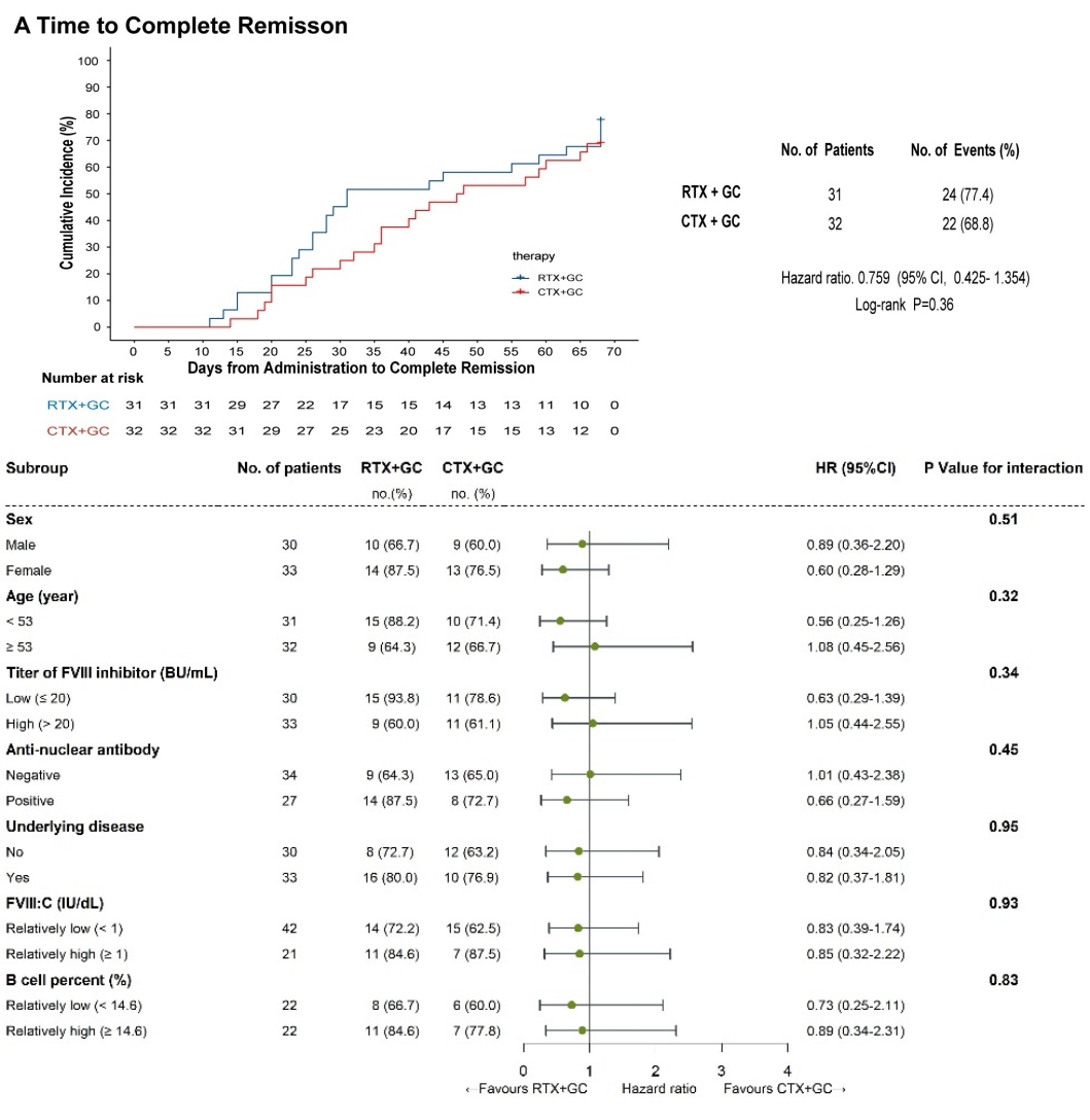 獲得性血友病A是一種由于抗凝血因子Ⅷ(FⅧ)自身抗體(抑制物)的出現(xiàn)導致FⅧ活性降低的獲得性出血性疾病,這種疾病罕見且嚴重。目前國際/中國指南均推薦確診后立即啟動免疫抑制治療以清除FⅧ抑制物、恢復FⅧ活性,從而避免難以預料的出血。但是目前尚無高質(zhì)量循證醫(yī)學證據(jù)比較激素聯(lián)合利妥昔單抗或聯(lián)合環(huán)磷酰胺這兩種一線聯(lián)合療法的優(yōu)劣。同時研究團隊既往回顧性分析發(fā)現(xiàn)單劑量利妥昔單抗聯(lián)合激素的療效與常規(guī)方案相似,且可以降低免疫抑制的強度以減少感染的風險、降低患者的醫(yī)療負擔。本研究自2017年12月至2022年6月納入了5個研究中心的63例成年初治獲得性血友病A患者并隨機分配至兩治療組,激素聯(lián)合單劑量利妥昔單抗組和聯(lián)合環(huán)磷酰胺組的完全緩解率分別為77.4%和68.8%,兩組分別有80.6%和81.3%的患者達到部分緩解,且兩組在各亞組中的療效及安全性評價未見差異。