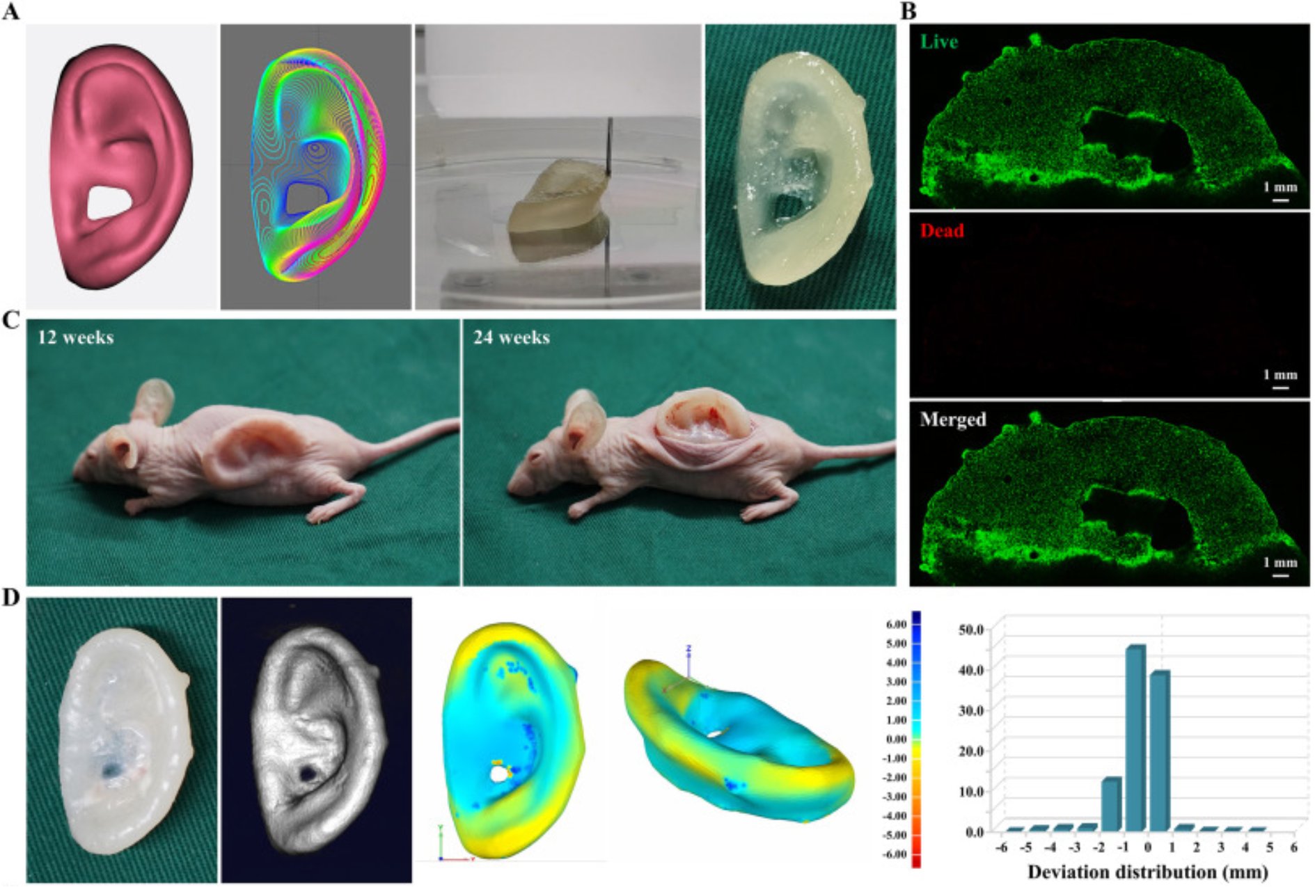 耳廓作為人體面部的主要特征之一,耳廓發(fā)育畸形或缺損會嚴重影響患者的外觀及功能,對患者的身心健康造成嚴重影響。臨床常用的耳重建方法主要是自體肋軟骨耳支架,但存在創(chuàng)傷較大、對術(shù)者耳支架雕刻技術(shù)要求較高,且有胸廓畸形的可能。組織工程技術(shù)為耳廓重建提供了一種有前景的治療策略。近年來,3D生物打印技術(shù)的興起為組織工程提供了更先進的手段,可以實現(xiàn)細胞和材料的精確空間分布,在組織和器官的仿生構(gòu)建中具有顯著的應(yīng)用優(yōu)勢。天然水凝膠類材料因具有良好的生物相容性和可打印性逐漸成為3D生物打印墨水的研究熱點。該研究團隊針對傳統(tǒng)水凝膠成分單一難以模擬軟骨微環(huán)境,質(zhì)地致密限制細胞行為以及力學性能差難以維持精確三維形態(tài)等技術(shù)瓶頸,研制了基于軟骨脫細胞基質(zhì)的光敏水凝膠仿生軟骨特異性微環(huán)境,應(yīng)用聚環(huán)氧乙烷產(chǎn)生微孔結(jié)構(gòu)促進細胞行為和軟骨形成,引入高強度和慢降解的聚己內(nèi)酯形成支撐框架,整合多噴嘴3D生物打印技術(shù),精確控制載軟骨細胞生物墨水和支撐材料的分布,制備了精確形態(tài)和良好力學性能的耳廓構(gòu)建物,并在體內(nèi)再生為形態(tài)保真度高、彈性好、有豐富的軟骨特異性細胞外基質(zhì)沉積的成熟耳廓軟骨樣組織。