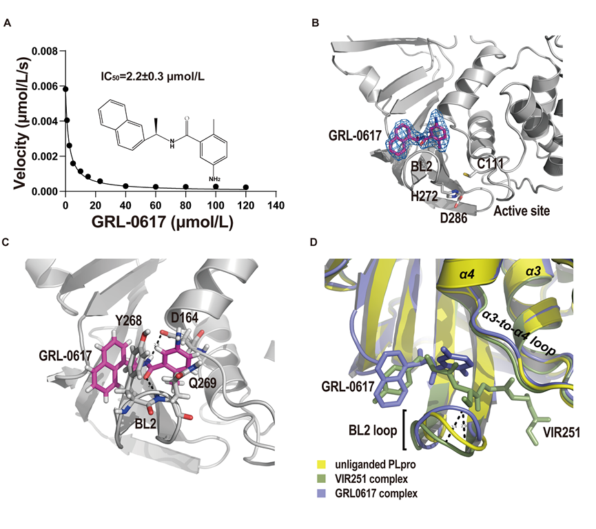 圖:GRL0617抑制SARS-CoV-2 PLpro活性及結(jié)構(gòu)基礎(chǔ)
