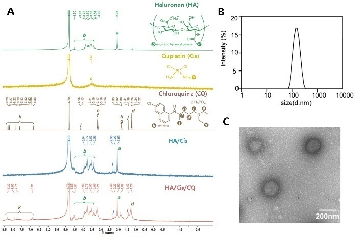 圖1. HA/Cis/CQ納米凝膠的制備與表征。(A)1H NMR分析。(B)HA/Cis/CQ的DLS測試。(C)HA/Cis/CQ的TEM表征。