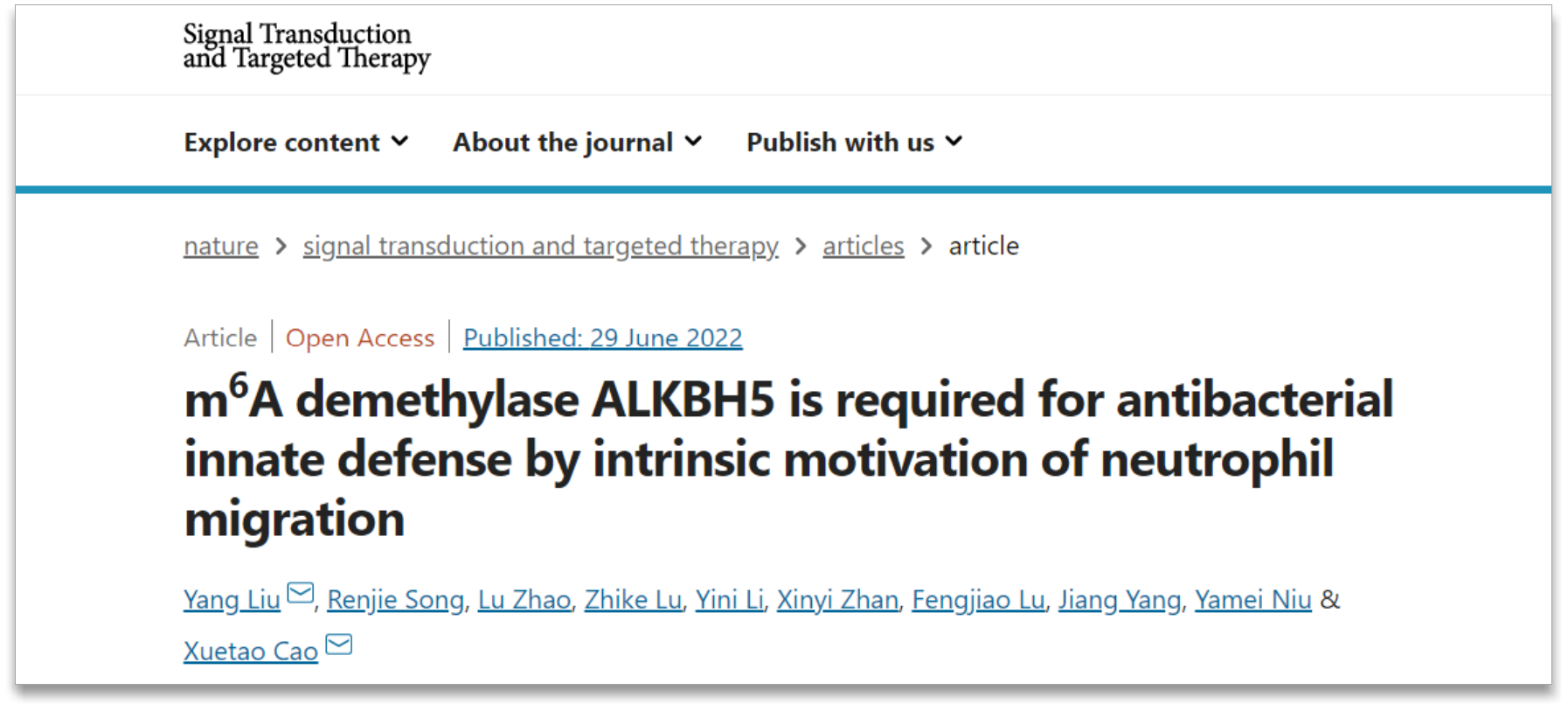 2022年6月29日,中國醫(yī)學科學院基礎醫(yī)學研究所暨中國醫(yī)學科學院免疫治療研究中心曹雪濤院士團隊在Signal Transduction and Targeted Therapy雜志發(fā)表了題為“m6A demethylase ALKBH5 is required for antibacterial innate defense by intrinsic motivation of neutrophil migration”的研究論文。研究報道了alkB同源物5 RNA去甲基化酶(alkB homolog 5 RNA demethylase,ALKBH5)在機體抗菌免疫防御過程中發(fā)揮著至關重要的作用,首次揭示了中性粒細胞ALKBH5及N6-甲基腺嘌呤(N6-methyladenosine,m6A)RNA修飾可以調(diào)控其遷移能力的表觀新機制。