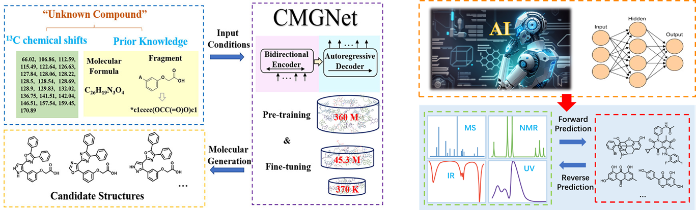 圖2. (左)GMGNet模型基于13C NMR結(jié)構(gòu)解析的工作流程;(右)AI在四大光譜中的應(yīng)用