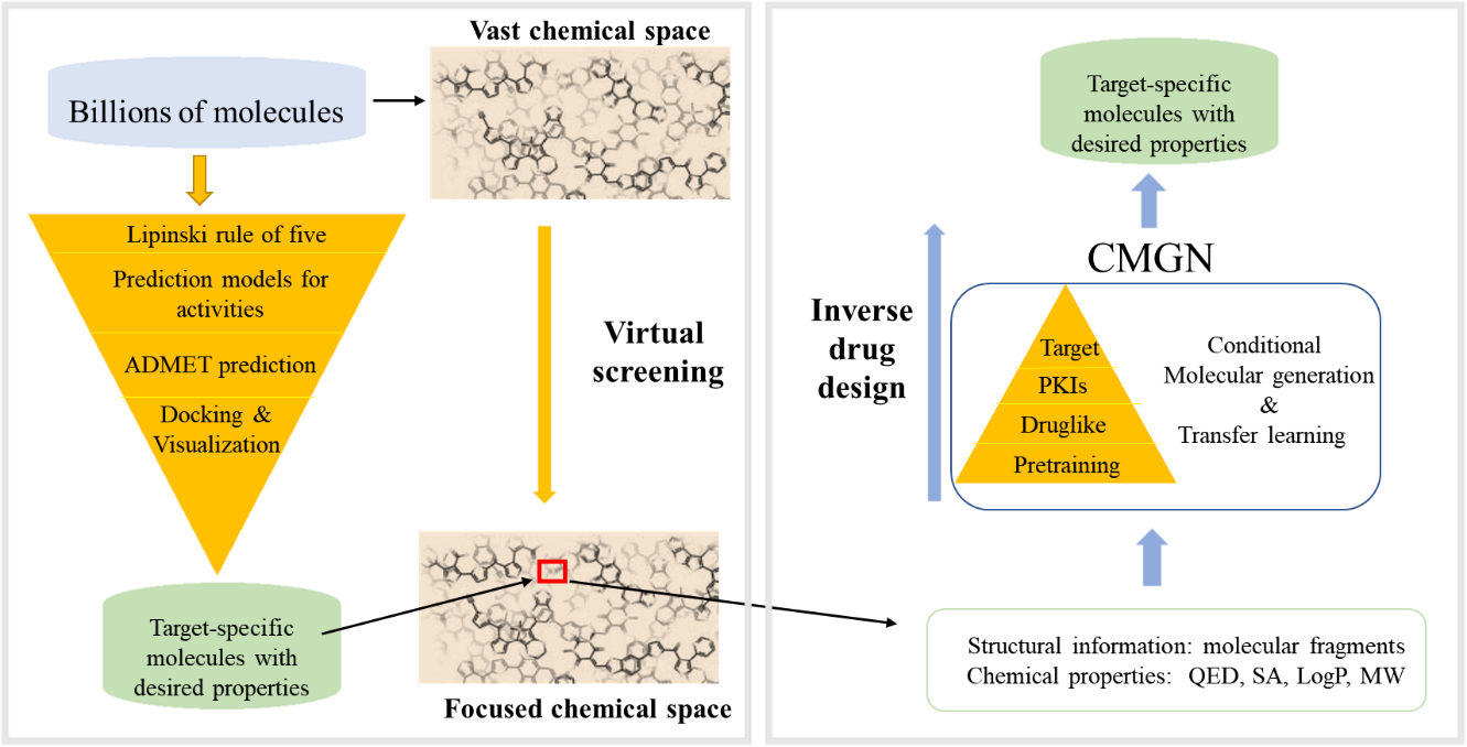 圖1. CMGN與傳統(tǒng)藥物設(shè)計對比,及其通過遷移學(xué)習(xí)及性質(zhì)調(diào)節(jié)解決分子逆問題的應(yīng)用策略