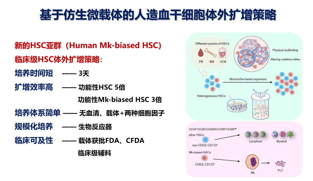 該研究制作了在剛性、孔徑、材料等方面模仿骨髓微環(huán)境的仿生微載體,將之添加到細(xì)胞培養(yǎng)體系中,發(fā)現(xiàn)該體系能以多種來源細(xì)胞為原料,擴(kuò)增較原始的造血干細(xì)胞(HSC)亞群。通過極限稀釋移植實驗得出,微載體將功能性造血干細(xì)胞擴(kuò)增了5.01倍。在生物反應(yīng)器內(nèi)應(yīng)用該擴(kuò)增策略后,實現(xiàn)了臍帶血單核細(xì)胞(UCB MNC)為起始細(xì)胞的HSC體外規(guī)?;瘮U(kuò)增,功能性干細(xì)胞擴(kuò)增達(dá)7.39倍。
