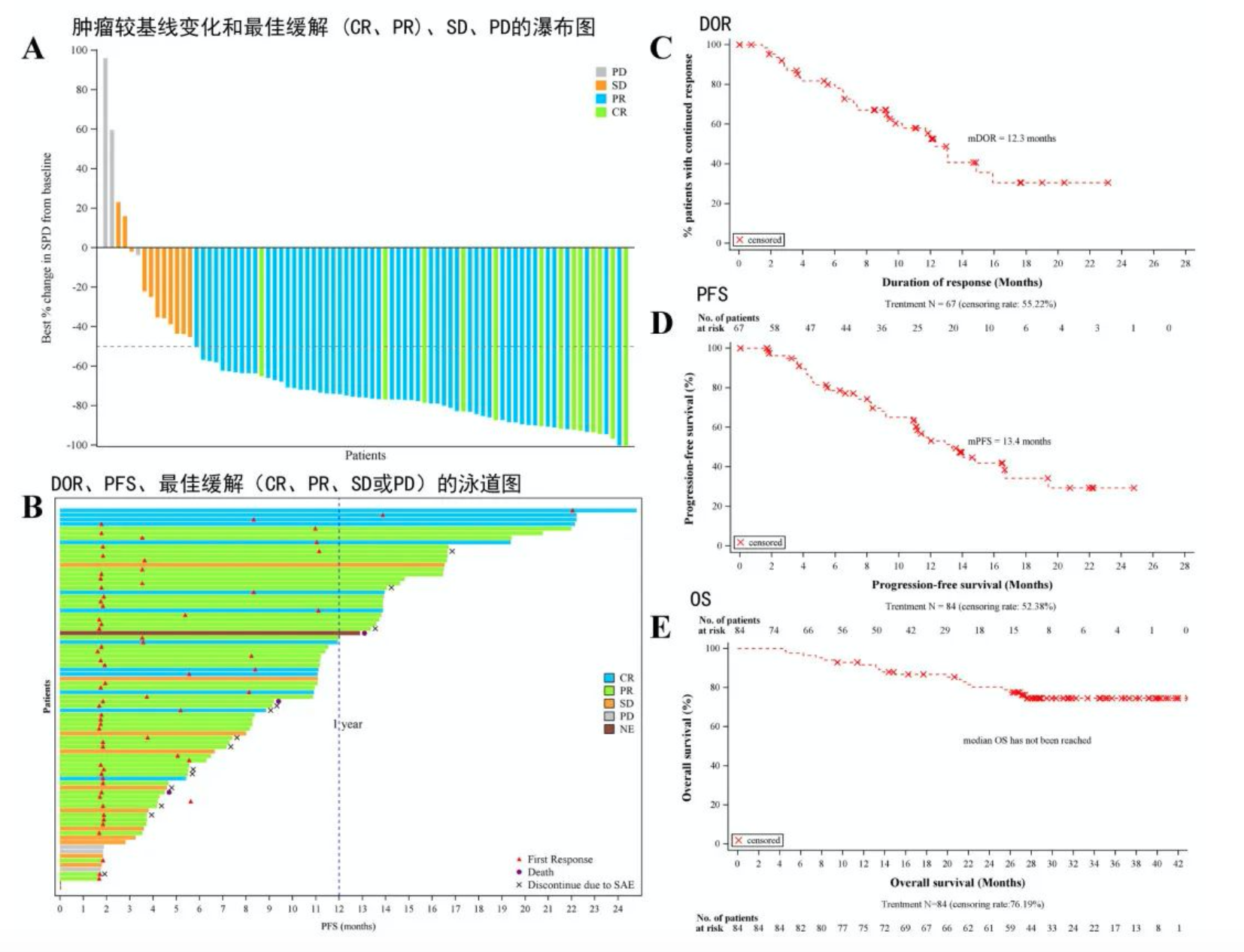 研究納入經過二線及以上系統(tǒng)治療后R/R FL。共篩選114例R/R FL患者,其中84例納入全集分析(FAS)。截至2021年9月30日,中位隨訪時間16.7個月。獨立評審委員會(IRC)評估結果為客觀緩解率ORR 79.8%,其中13例患者(15.5%)獲得完全緩解(CR),54例患者(64.3%)獲得部分緩解(PR),達到緩解的中位時間為1.9個月。中位無進展生存時間(PFS)13.4個月(11.1-16.7個月),中位總生存時間(OS)未達到,已超過42個月。