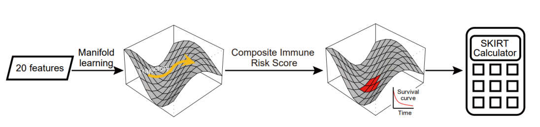 通過生存分析聯(lián)合Grid-Search優(yōu)化策略,經(jīng)交叉驗(yàn)證發(fā)現(xiàn)移植后91–180天的免疫學(xué)特征可以預(yù)測異基因移植患者生存。為了尋找一個與“體質(zhì)指數(shù)BMI”一樣簡單的計(jì)算方法,該研究通過整合八個關(guān)鍵免疫學(xué)指標(biāo),提出了易于臨床使用的綜合免疫風(fēng)險(xiǎn)評分(Composite Immune Risk Score, CIRS)來預(yù)測患者造血干細(xì)胞移植后的生存情況。CIRS在訓(xùn)練集可以很好地預(yù)測全因死亡(HR = 2.69, P < 0.0001),并在獨(dú)立的驗(yàn)證集(HR = 3.64, P = 0.0014)及外部測試集(HR = 2.44, P = 0.0087)得到證實(shí)。研究團(tuán)隊(duì)還開發(fā)了可公開訪問的網(wǎng)絡(luò)工具— SKIRT計(jì)算器(https://skirt-calculator.shinyapps.io/skirt-calculator/),幫助臨床醫(yī)生評估患者移植后免疫重塑進(jìn)展。