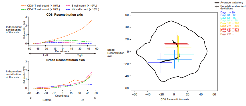 研究發(fā)現(xiàn),移植后的前兩個月細(xì)胞數(shù)量恢復(fù)以CD8+ T細(xì)胞為主,隨后NK細(xì)胞、CD8+T細(xì)胞、CD4+T細(xì)胞和B細(xì)胞廣泛恢復(fù),免疫重塑個體異質(zhì)性在移植后約60天達(dá)到最大。