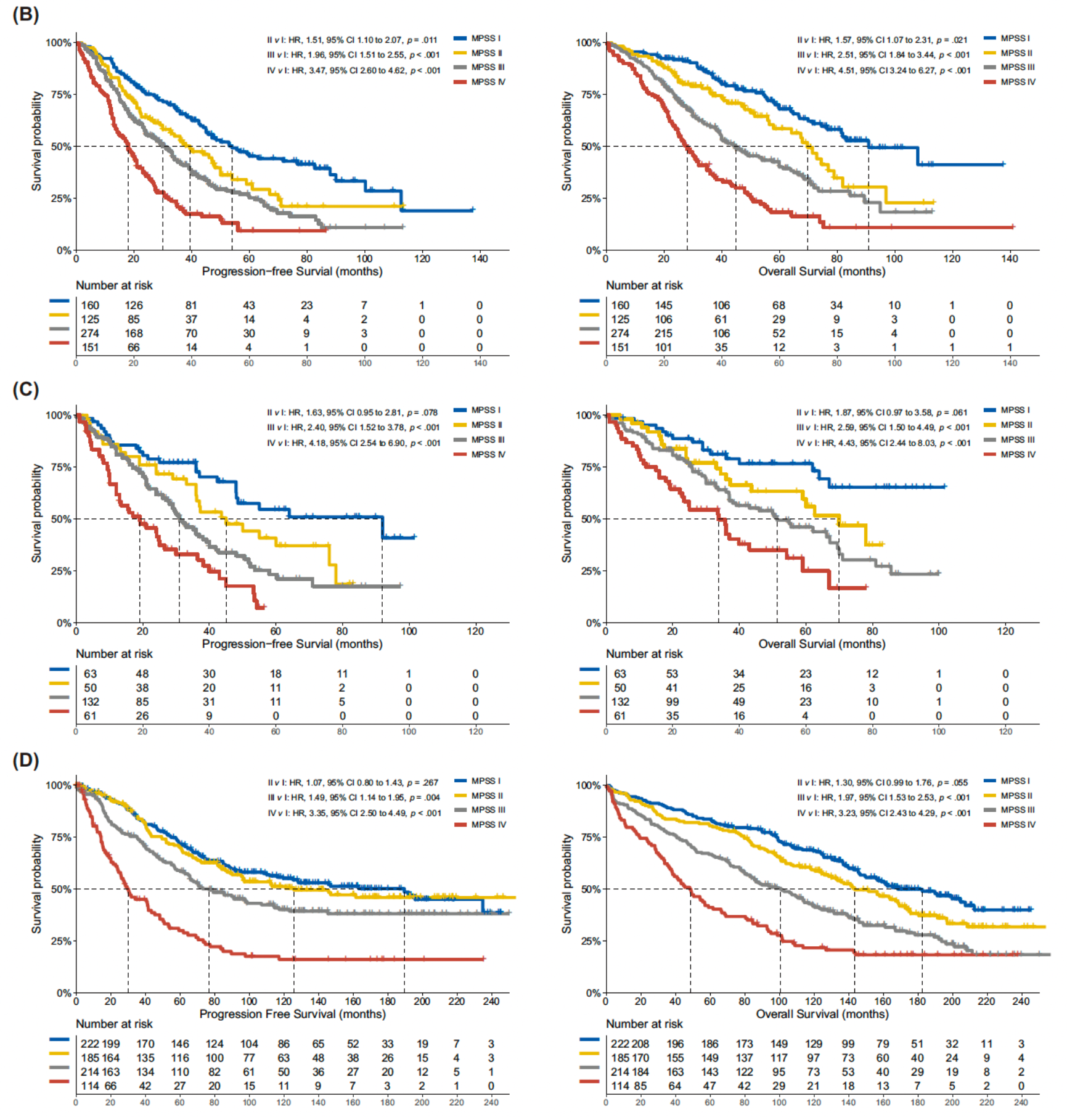 結(jié)果表明,訓(xùn)練隊(duì)列中患者血小板減少、乳酸脫氫酶升高、國際分期系統(tǒng)(ISS)III期、高危遺傳學(xué)異常(HRA)的數(shù)目具有獨(dú)立預(yù)后意義。根據(jù)不同因素的總生存期(OS)危險(xiǎn)比進(jìn)行賦分(血小板減少2分、乳酸脫氫酶升高1分、ISS III期2分、1個(gè)HRA 1分、≥2個(gè)HRA 2分),可將訓(xùn)練隊(duì)列中患者分為4組:MPSS Ⅰ期(22.5%,0分)、Ⅱ期(17.6%,1分)、Ⅲ期(38.6%,2-3分)和Ⅳ期(21.3%,4-7分)。不同風(fēng)險(xiǎn)組患者的預(yù)后存在顯著差異,MPSS I期至IV期組患者的中位OS分別為91.0、69.8、45.0和28.0個(gè)月(P<0.001)。同時(shí),MPSS模型在內(nèi)部驗(yàn)證隊(duì)列和外部驗(yàn)證隊(duì)列中均顯示出卓越的預(yù)后價(jià)值,顯著優(yōu)于經(jīng)典預(yù)后模型(R-ISS、R2-ISS和MASS)。