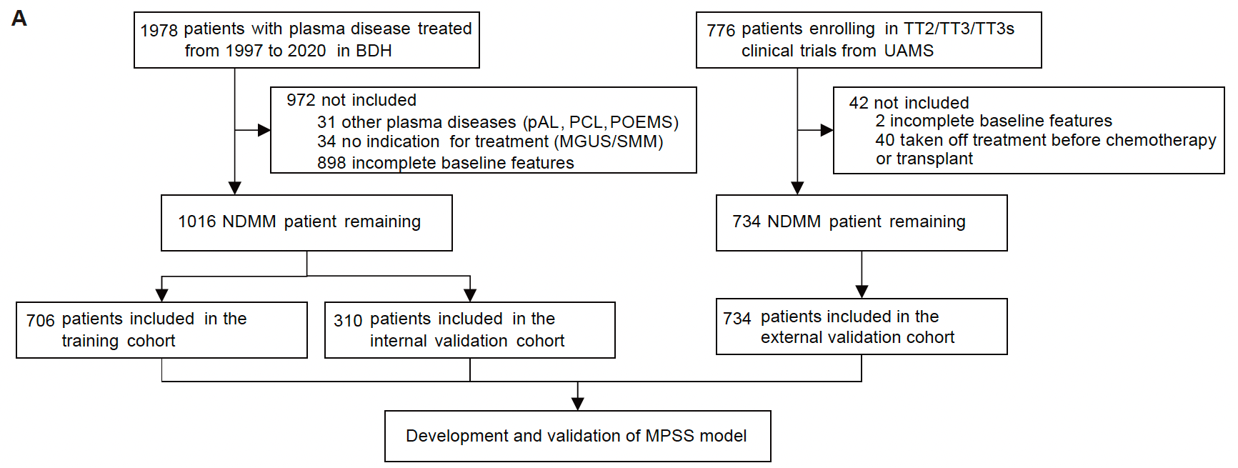 2024年1月21日,中國醫(yī)學(xué)科學(xué)院血液病醫(yī)院(中國醫(yī)學(xué)科學(xué)院血液學(xué)研究所)安剛/邱錄貴團(tuán)隊(duì)在American Journal of Hematology《美國血液學(xué)雜志》在線發(fā)布了題為“Development and validation of an individualized and weighted myeloma prognostic score system (MPSS) in patients with newly diagnosed multiple myeloma”(個(gè)體化加權(quán)骨髓瘤預(yù)后評(píng)分系統(tǒng)(MPSS)在新診斷的多發(fā)性骨髓瘤患者中的開發(fā)和驗(yàn)證)的研究論文。該研究依托于中國首個(gè)前瞻縱向血液病隊(duì)列和美國阿肯色大學(xué)Total Therapy(TTs)系列臨床試驗(yàn)隊(duì)列,建立并驗(yàn)證了全新的MM預(yù)后分層模型(MPSS),證實(shí)該模型在不同MM人群中的卓越預(yù)測(cè)價(jià)值。