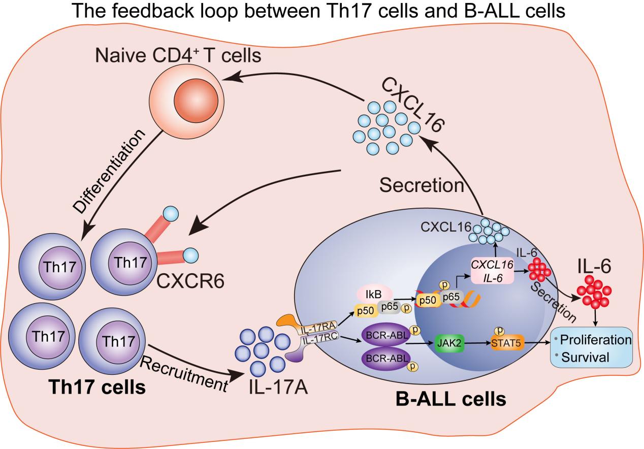 該研究團隊首先檢測正常人骨髓樣本和Ph+B-ALL骨髓樣本中Th17細胞的比例,發(fā)現(xiàn)Th17細胞的比例在Ph+B-ALL病人樣本中呈現(xiàn)高表達,并且Th17細胞分泌的白介素17A因子(IL-17A)在Ph+B-ALL病人血清中也明顯升高。隨后在自發(fā)B-ALL的轉(zhuǎn)基因小鼠(BCR-ABLtTA)模型上也得到類似結(jié)果。IL-17A能夠促進B-ALL細胞的增殖,給予IL-17A能夠明顯加速白血病疾病進程,而敲除IL-17A或者使用抗IL-17A中和抗體能夠明顯抑制B-ALL疾病進程。進一步研究發(fā)現(xiàn),IL-17A通過激活BCR-ABL、JAK/STAT和NF/KB信號通路來維持B-ALL細胞的增殖和CXCL16因子的分泌。而白血病細胞分泌的CXCL16因子能夠進一步促進Th17細胞募集到白血病微環(huán)境,Th17細胞與白血病細胞Niche的形成在介導(dǎo)B-ALL疾病發(fā)生發(fā)展中發(fā)揮重要作用。使用抗IL-17A或抗CXCL16中和性抗體能夠破壞白血病骨髓等部位干性微環(huán)境的形成,進而抑制Ph+ B-ALL的疾病進展。本研究揭示了IL-17A或CXCL16作為干預(yù)Ph+ B-ALL潛在治療靶點,驗證了抗IL-17A或抗CXCL16抗體聯(lián)合伊馬替尼的抗Ph+ B-ALL治療效果,為Ph+ B-ALL的治療提供新思路和干預(yù)新策略。