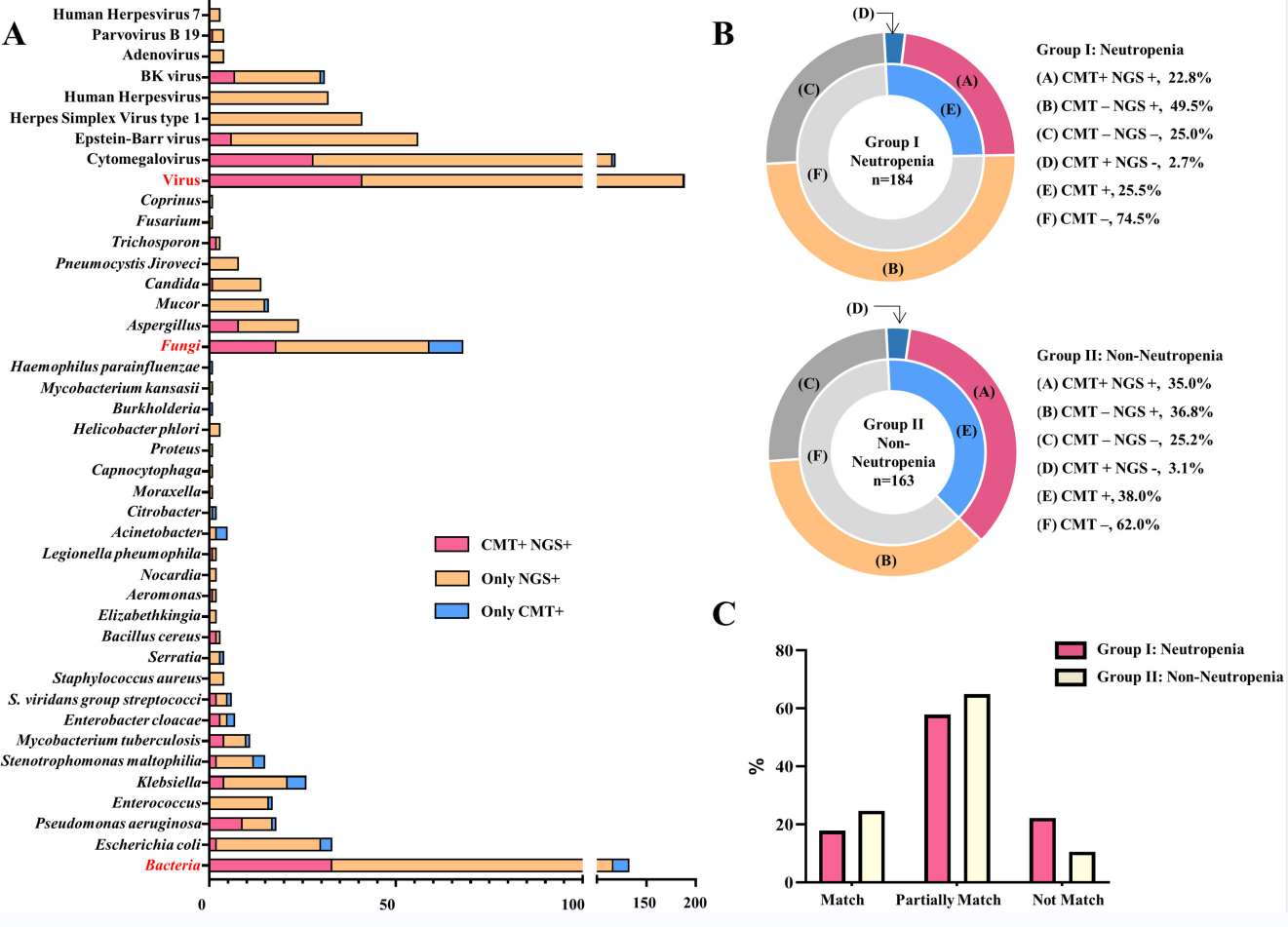 研究顯示,血液樣本病原mNGS檢測的陽性率明顯高于傳統(tǒng)微生物學(xué)檢測(72.6% vs. 31.4%),血液樣本病原mNGS檢測的靈敏度為82.6%,特異度為59.0%。與非粒缺組患者相比,粒缺組傳統(tǒng)微生物學(xué)檢測陽性率明顯低于非粒缺組,聯(lián)合血液樣本病原mNGS檢測可以提高病原檢出率。同時,血液樣本病原mNGS相比傳統(tǒng)微生物學(xué)檢測,檢出的微生物種類更多,尤其對于肺孢子菌、毛霉、諾卡菌、分枝桿菌等傳統(tǒng)微生物學(xué)檢測陽性率較低的病原種類,血液樣本病原mNGS檢測性能明顯優(yōu)于傳統(tǒng)微生物學(xué)檢測。
