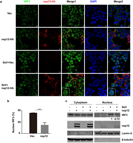 前期病原生物學研究所王健偉課題組在Nature Communications發(fā)表的研究初步闡明新型冠狀病毒天然免疫逃逸機制的研究,報道了SARS-CoV-2感染進程中的干擾素反應,系統(tǒng)篩選了病毒編碼蛋白對于干擾素產(chǎn)生和下游信號通路的影響。本研究在之前篩選的23個SARS-CoV-2編碼蛋白對于I型干擾素產(chǎn)生影響的基礎上,進一步對SARS-CoV-2的聚合酶nsp12拮抗I型干擾素的作用及機制進行了深入研究,并于2021年2月26日在Cellular & Molecular Immunology雜志發(fā)表題為《SARS-CoV-2 nsp12 attenuates type I interferon production by inhibiting IRF3 nuclear translocation》的論文。該研究發(fā)現(xiàn)nsp12可以抑制仙臺病毒和poly(I:C)介導的I型干擾素的產(chǎn)生,而對于干擾素下游信號通路則無抑制作用。nsp12作用于重要轉(zhuǎn)錄因子IRF3的下游,但并不影響IRF3的磷酸化,而是通過抑制IRF3的核轉(zhuǎn)移從而抑制I型干擾素的產(chǎn)生。最后通過突變,發(fā)現(xiàn)nsp12聚合酶活性位點突變體仍然可以抑制IRF3的核轉(zhuǎn)移,進而抑制I型干擾素的產(chǎn)生,說明nsp12拮抗I型干擾素產(chǎn)生的作用與其聚合酶活性無關。
