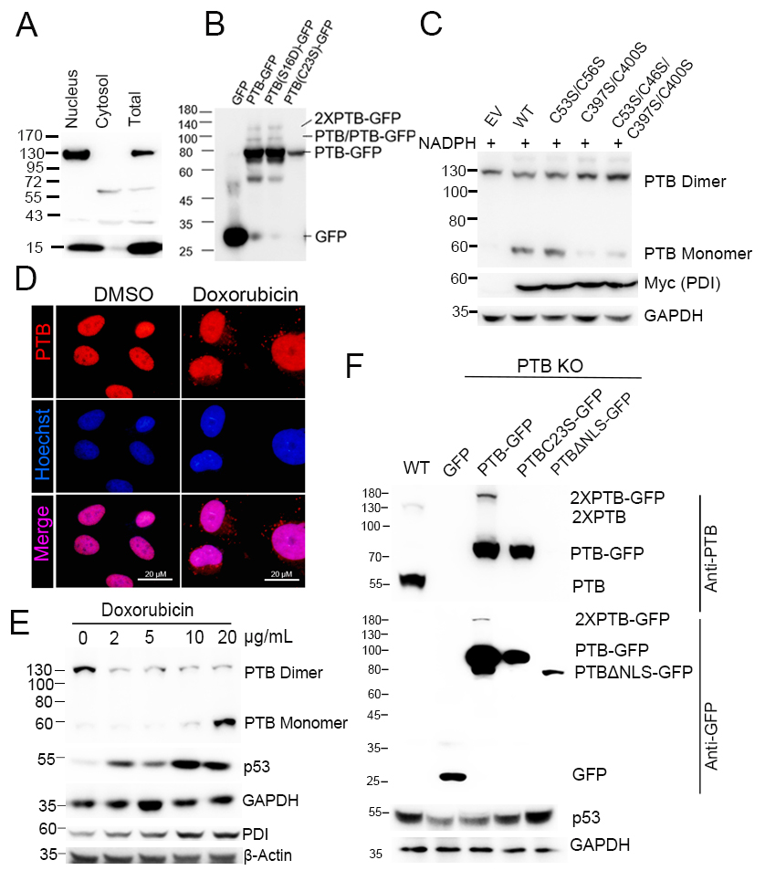 本研究團(tuán)隊首次發(fā)現(xiàn)PTB在細(xì)胞核和細(xì)胞質(zhì)中分別形成二聚體和單體,并將介導(dǎo)二聚體形成的氨基酸定位到第23位半胱氨酸;分子內(nèi)或分子間半胱氨酸之間形成二硫鍵是最常見的蛋白質(zhì)多聚體形成機(jī)制,這個過程主要是由硫氧還蛋白(thioredoxin,TRX)超家族催化。研究團(tuán)隊對該家族的成員進(jìn)行篩選后,發(fā)現(xiàn)蛋白質(zhì)二硫鍵異構(gòu)酶(protein disulfide isomerase,PDI)是調(diào)控PTB去二聚化的關(guān)鍵分子,并在DNA損傷模型中得到證實;進(jìn)一步探討了DNA損傷應(yīng)答中PTB去二聚化后的功能和機(jī)制,發(fā)現(xiàn)細(xì)胞質(zhì)中的PTB單體能夠促進(jìn)p53的翻譯,免疫沉淀和質(zhì)譜鑒定結(jié)果提示這種作用可能是通過增加TP53 mRNA與翻譯機(jī)器的相互作用來實現(xiàn)的。本研究揭示了RNA結(jié)合蛋白多聚體和單體的相互轉(zhuǎn)換能夠影響其亞細(xì)胞定位,進(jìn)而對下游基因的翻譯進(jìn)行調(diào)控,擴(kuò)展了對RNA結(jié)合蛋白作用機(jī)制的認(rèn)識。