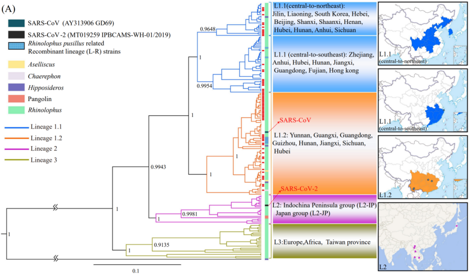 圖2. 蝙蝠Sarbecovirus亞屬冠狀病毒分布及系統(tǒng)分化圖