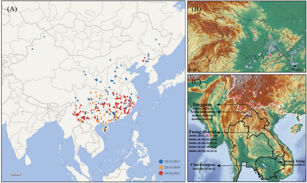 本文指出,我國境內(nèi)菊頭蝠種群中SARS-CoV-2相關(guān)冠狀病毒(SC2r-CoV)的循環(huán)非常有限,需要在現(xiàn)有邊境采樣點的更南部和東南亞地區(qū)開展研究,來探索與SARS-CoV和SARS-CoV-2關(guān)聯(lián)性更高的動物冠狀病毒多樣性,進一步尋找其直接祖先。同時,應(yīng)該進一步加強蝙蝠攜帶重組冠狀病毒的監(jiān)測,來預(yù)警未來新發(fā)傳染病的發(fā)生。目前國際權(quán)威機構(gòu)發(fā)現(xiàn)中南半島地區(qū)蝙蝠攜帶與SARS-CoV-2同源性更高的SC2r-CoV(Temmam et al. Nature. 2022),這個結(jié)果驗證了本研究的結(jié)論和推測。