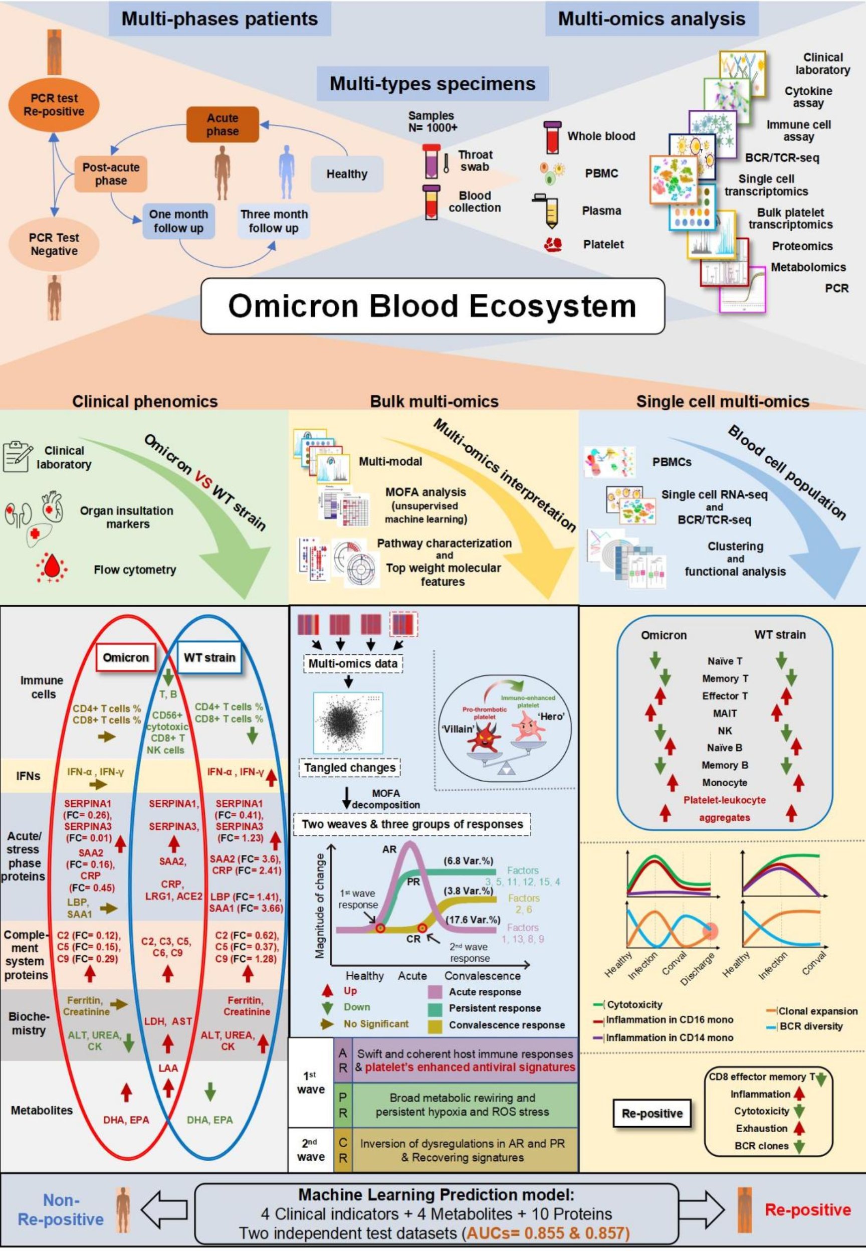 血液生態(tài)系統(tǒng)由不同的血細(xì)胞、微環(huán)境細(xì)胞、血漿各成分間復(fù)雜而高度協(xié)調(diào)的相互作用組成,是維持組織器官之間互作的信息紐帶。血液生態(tài)的失衡是感染及各種其他系統(tǒng)性疾病發(fā)生發(fā)展的重要根源。因此血液生態(tài)的研究對(duì)于解析感染等系統(tǒng)疾病的分子景觀具有重要價(jià)值,對(duì)于臨床預(yù)警、預(yù)防及治療具有重要意義。奧密克戎(Omicron)毒株是迄今為止最廣泛關(guān)注的變異株,然而相較于原始毒株,公眾對(duì)其潛在分子機(jī)制仍知之甚少。該研究收集了1000多個(gè)來自新冠奧密克戎毒株感染者的血細(xì)胞和血漿樣本,通過對(duì)其臨床表型、轉(zhuǎn)錄組、蛋白質(zhì)組、代謝組和免疫庫等的系統(tǒng)性解析,揭示了新冠奧密克戎感染者血液生態(tài)系統(tǒng)中獨(dú)特的血小板和免疫景觀。團(tuán)隊(duì)還開發(fā)了一個(gè)基于多個(gè)血漿分子標(biāo)志物及臨床指標(biāo)的聯(lián)合機(jī)器學(xué)習(xí)模型,實(shí)現(xiàn)了對(duì)奧密克戎患者復(fù)陽的提前預(yù)警,并獲得了國家發(fā)明專利授權(quán)。