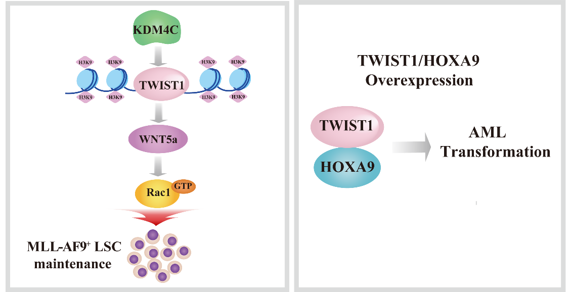 該研究證實TWIST1在MLL-AF9 LSC中具有極高的表達水平,且它的高表達是由KDM4C基因通過降低組蛋白H3賴氨酸9三甲基化修飾(H3K9me3)水平所調(diào)控。TWIST1是LSC維持存活、靜息態(tài)和自我更新能力所必需的,促進MLL-AF9融合蛋白介導(dǎo)的AML的發(fā)生和進展。隨后,該研究通過質(zhì)譜分析、免疫共沉淀以及GST pull-down實驗首次報道TWIST1和HOXA9存在直接相互作用,并共同誘導(dǎo)急性髓系白血病發(fā)生。最后,該研究利用轉(zhuǎn)錄組測序證實TWIST1通過直接轉(zhuǎn)錄激活WNT5a/RAC1通路來調(diào)控LSC功能。該研究有助于深入理解MLL-AF9 AML發(fā)病機制,為發(fā)現(xiàn)新的臨床治療靶點提供重要理論依據(jù)。