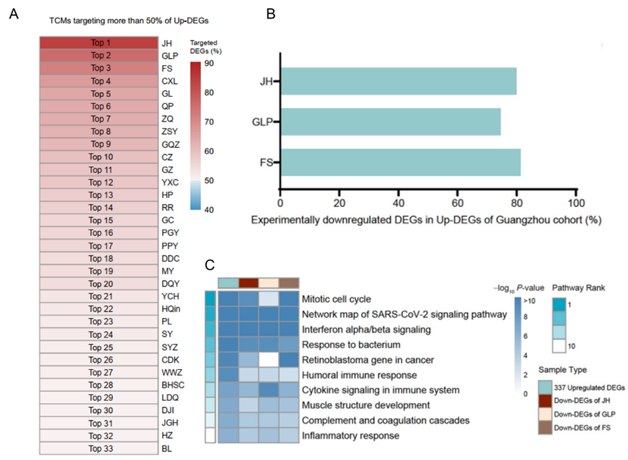 A.33種靶向50%以上新冠上調(diào)基因的中藥飲片。B, C.橘紅、瓜蔞皮、佛手中sRNA基因表達(dá)調(diào)節(jié)作用。