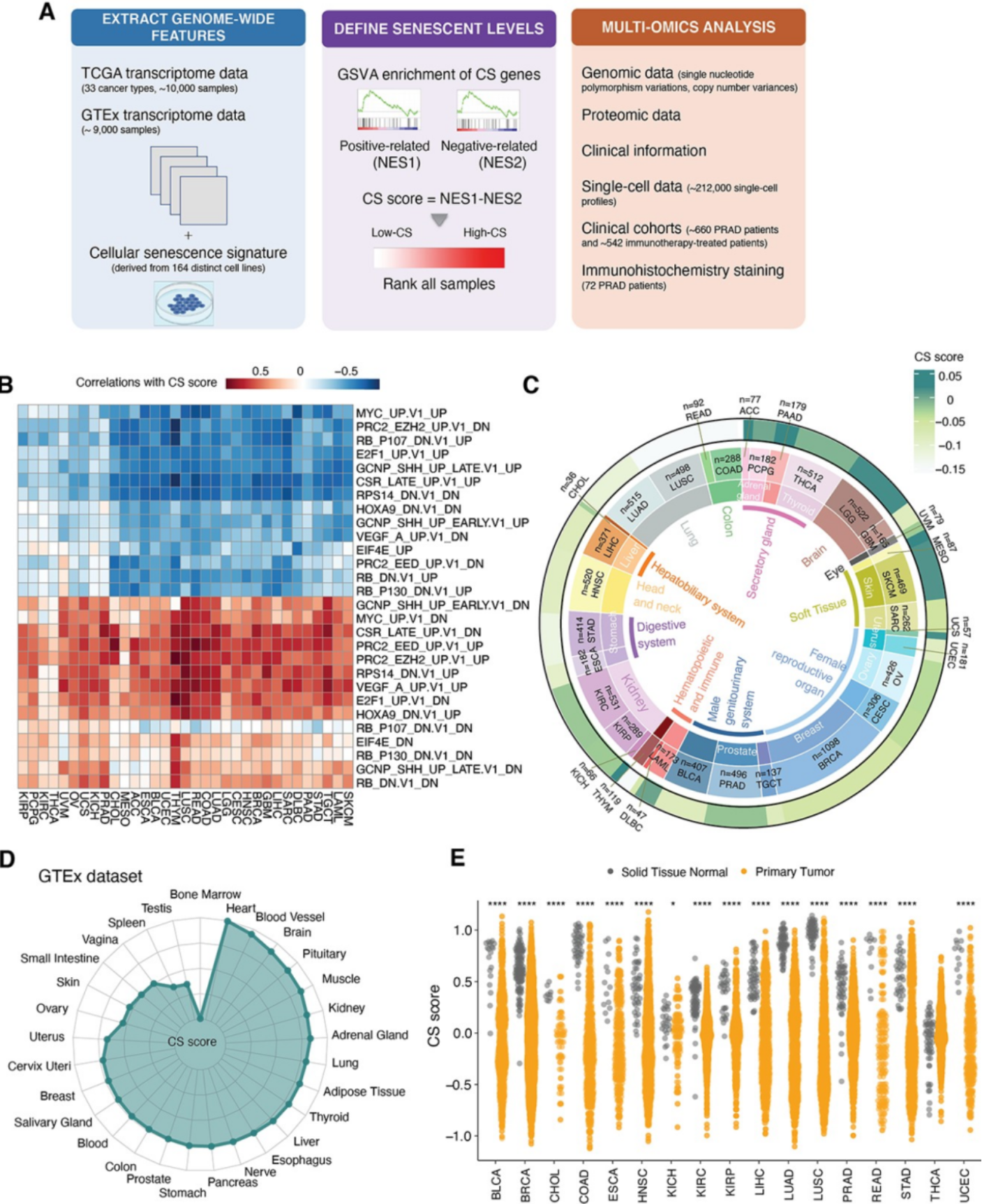 本研究團(tuán)隊(duì)通過(guò)整合164組人源細(xì)胞系的細(xì)胞衰老的共同特征,定義了cellular senescence (CS) score作為衰老水平的度量,并基于此描繪了33種癌癥類型的細(xì)胞衰老景觀(圖1)。不同癌癥展示出細(xì)胞衰老水平的組織特異性,且腫瘤組織的細(xì)胞衰老水平普遍低于正常組織。進(jìn)一步對(duì)約20,000名癌癥患者和212,000個(gè)單細(xì)胞的多組學(xué)數(shù)據(jù)分析表明,部分癌癥的基因組不穩(wěn)定性與CS score負(fù)相關(guān),而免疫激活程度呈現(xiàn)出與細(xì)胞衰老水平的正相關(guān),特別是在前列腺癌癥中,細(xì)胞衰老水平更高的腫瘤傾向于擁有免疫激活的微環(huán)境。此外,本研究采用機(jī)器學(xué)習(xí)的算法,在前列腺癌癥中篩選并驗(yàn)證和病人預(yù)后相關(guān)的關(guān)鍵衰老分子。對(duì)腫瘤中衰老水平的系統(tǒng)評(píng)估將有利于加深對(duì)衰老這一癌癥新特征的理解。