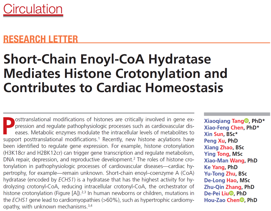 2021年3月9日,中國醫(yī)學科學院基礎醫(yī)學研究所劉德培團隊在Circulation上發(fā)表題為“Short-chain Enoyl-CoA Hydratase Mediates Histone Crotonylationand Contributes to Cardiac Homeostasis”的論文,研究發(fā)現(xiàn)Short-chain Enoyl-CoA Hydratase(ECHS1)在心臟中通過調控巴豆酰輔酶A水平維持心肌細胞穩(wěn)態(tài),首次揭示組蛋白巴豆?;揎椩谛募》屎竦刃难芗膊≈邪l(fā)揮的病理生理作用。