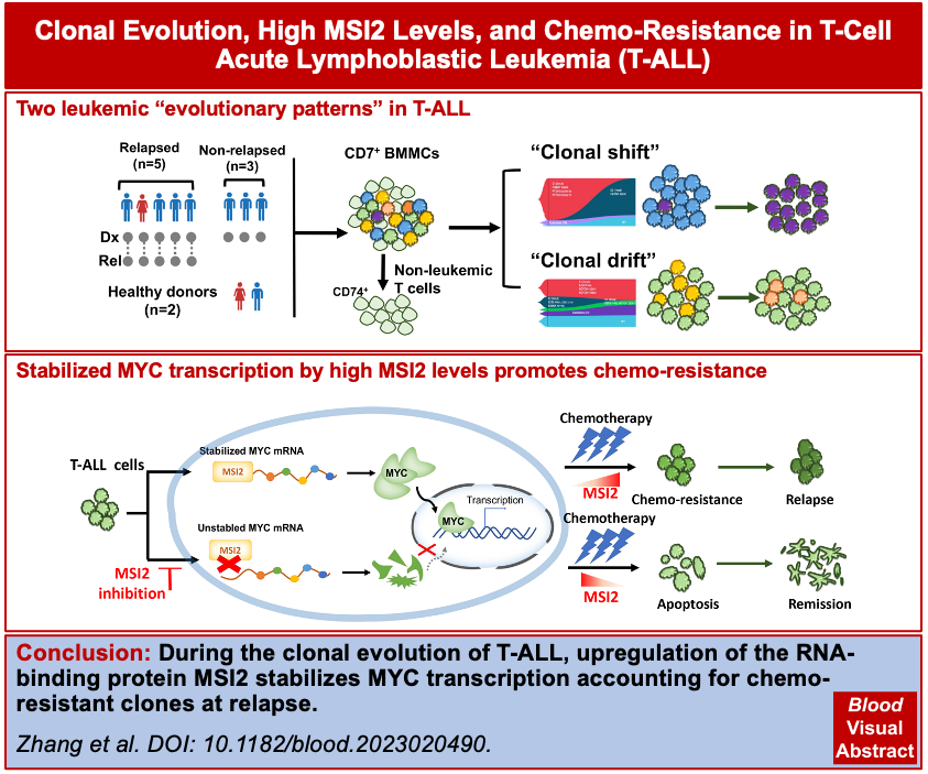 2023年10月6日,竺曉凡/張英馳團(tuán)隊(duì)在Blood《血液雜志》在線發(fā)布了題為“Clonal Evolution Dissection Reveals High MSI2 Level Promotes Chemo-resistance in T-cell Acute Lymphoblastic Leukemia”(急性T細(xì)胞淋巴細(xì)胞白血病克隆演化模式研究揭示MSI2參與化療耐藥機(jī)制研究)的研究論文。此研究利用單細(xì)胞多組學(xué)技術(shù)解析了兒童急性T細(xì)胞淋巴細(xì)胞白血病(T-ALL)的白血病克隆演化模式,揭示了克隆演化過(guò)程中RNA結(jié)合蛋白MSI2通過(guò)調(diào)控癌基因MYC表達(dá)誘導(dǎo)化療耐藥的分子機(jī)制。