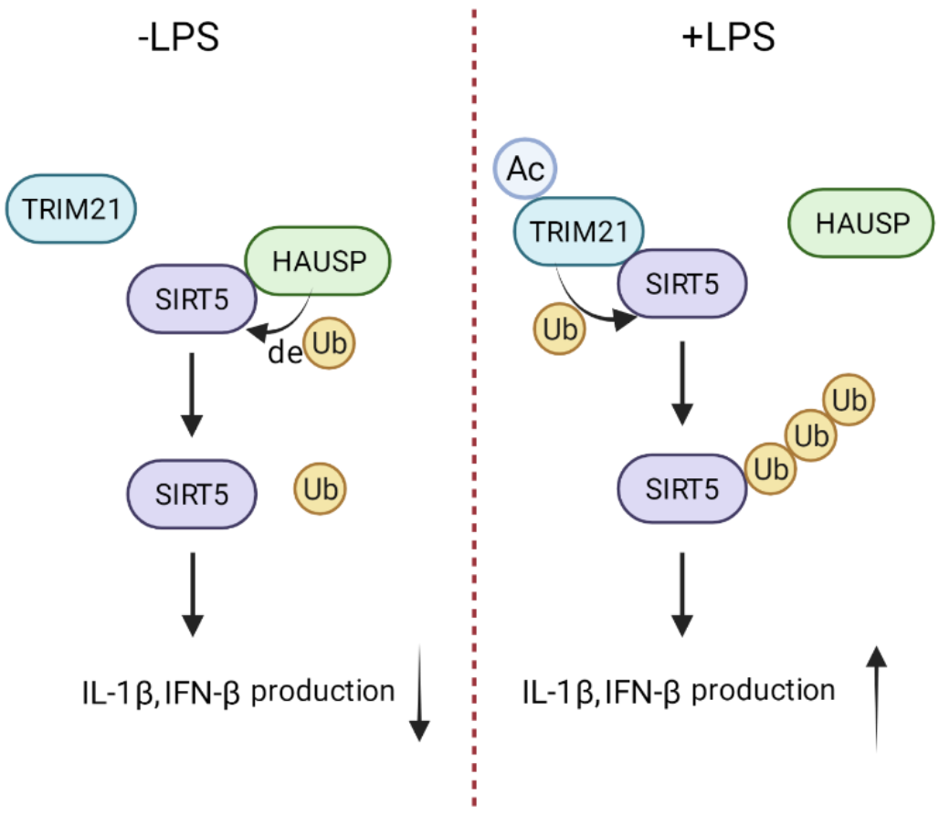 如圖所示,在沒有刺激的巨噬細(xì)胞內(nèi),SIRT5與HAUSP相互作用,發(fā)生去泛素化修飾,維持其較高的蛋白水平;當(dāng)細(xì)胞受到LPS等刺激時(shí),SIRT5偏向與TRIM21相互作用,TRIM21發(fā)揮泛素連接酶活性,從而介導(dǎo)SIRT5的蛋白降解和促進(jìn)炎性因子的釋放。反之,SIRT5還可以通過改變TRIM21的乙酰化修飾來調(diào)控其泛素連接酶活性。因此,通過TRIM21,LPS誘導(dǎo)了一個(gè)正反饋回路來控制SIRT5并使其保持在一個(gè)低水平,從而促進(jìn)了炎癥細(xì)胞因子的釋放。該研究發(fā)現(xiàn)了調(diào)控SIRT5蛋白降解的泛素連接酶TRIM21,并揭示了LPS刺激導(dǎo)致巨噬細(xì)胞釋放炎性因子的一個(gè)新的分子機(jī)制。該研究表明改變TRIM21-SIRT5相互作用的平衡可能作為一種潛在的炎癥性疾病的治療方法。