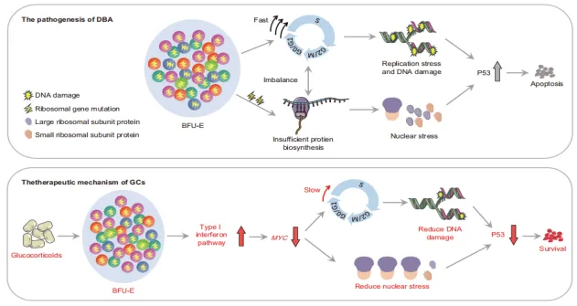 基于以上研究,本研究團隊認為,DBA患者在出生后紅系造血需求增加的壓力下紅系祖細胞細胞周期加快,被迫進入細胞周期S期,DNA復(fù)制壓力增加。由于核糖體蛋白基因突變導(dǎo)致的核糖體蛋白單倍劑量不足,無法滿足細胞周期加快的需求,進而導(dǎo)致P53激活、凋亡信號通路激活,紅系祖細胞凋亡增加。而糖皮質(zhì)激素可以通過減慢DBA患者紅系祖細胞細胞周期速度,減少紅系祖細胞凋亡,進而達到治療作用。