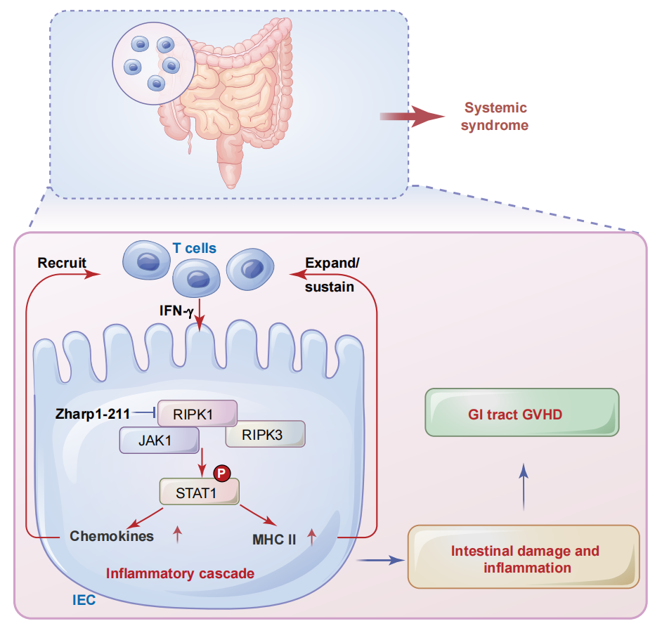 本研究團(tuán)隊(duì)首先發(fā)現(xiàn),在小鼠腸道IEC中選擇性抑制RIPK3可顯著降低小鼠腸道和肝臟中的GVHD病理反應(yīng)。對RIPK3上下游蛋白的研究展示,不同于RIPK3敲除或RIPK1激酶突變的小鼠,MLKL敲除的小鼠能延緩GVHD癥狀的出現(xiàn),但后期并不能改善小鼠的總生存率。通過對小鼠腸道IEC進(jìn)行轉(zhuǎn)錄組測序分析發(fā)現(xiàn),IEC中RIPK3具有獨(dú)立于MLKL、促進(jìn)T細(xì)胞趨化因子和MHC II類分子產(chǎn)生的功能。這些分子促進(jìn)腸道T細(xì)胞的浸潤以及同種異體T細(xì)胞反應(yīng)。進(jìn)一步研究表明,RIPK1/RIPK3能夠與JAK1形成復(fù)合物,增強(qiáng)IEC細(xì)胞中IFN-γ依賴的STAT1的激活,從而促進(jìn)趨化因子與主要組織相容性復(fù)合體II(MHC II)類分子表達(dá),募集與維持同種異體T細(xì)胞反應(yīng),最終導(dǎo)致腸組織損傷和GVHD的發(fā)生。臨床轉(zhuǎn)化研究證實(shí)在嚴(yán)重GVHD患者的結(jié)腸上皮中存在RIPK1的高度激活。該研究還發(fā)現(xiàn)了高效且具選擇性的新型RIPK1激酶抑制劑(Zharp1-211),可以顯著抑制IECs中JAK/STAT1介導(dǎo)的趨化因子和MHC II類分子的表達(dá),降低腸道上皮細(xì)胞炎癥,保護(hù)腸道干細(xì)胞與潘氏細(xì)胞,恢復(fù)腸道內(nèi)穩(wěn)態(tài),有效緩解GVHD,而且不影響移植物抗白血?。?/span>graft-versus-leukemia, GVL)效應(yīng)。