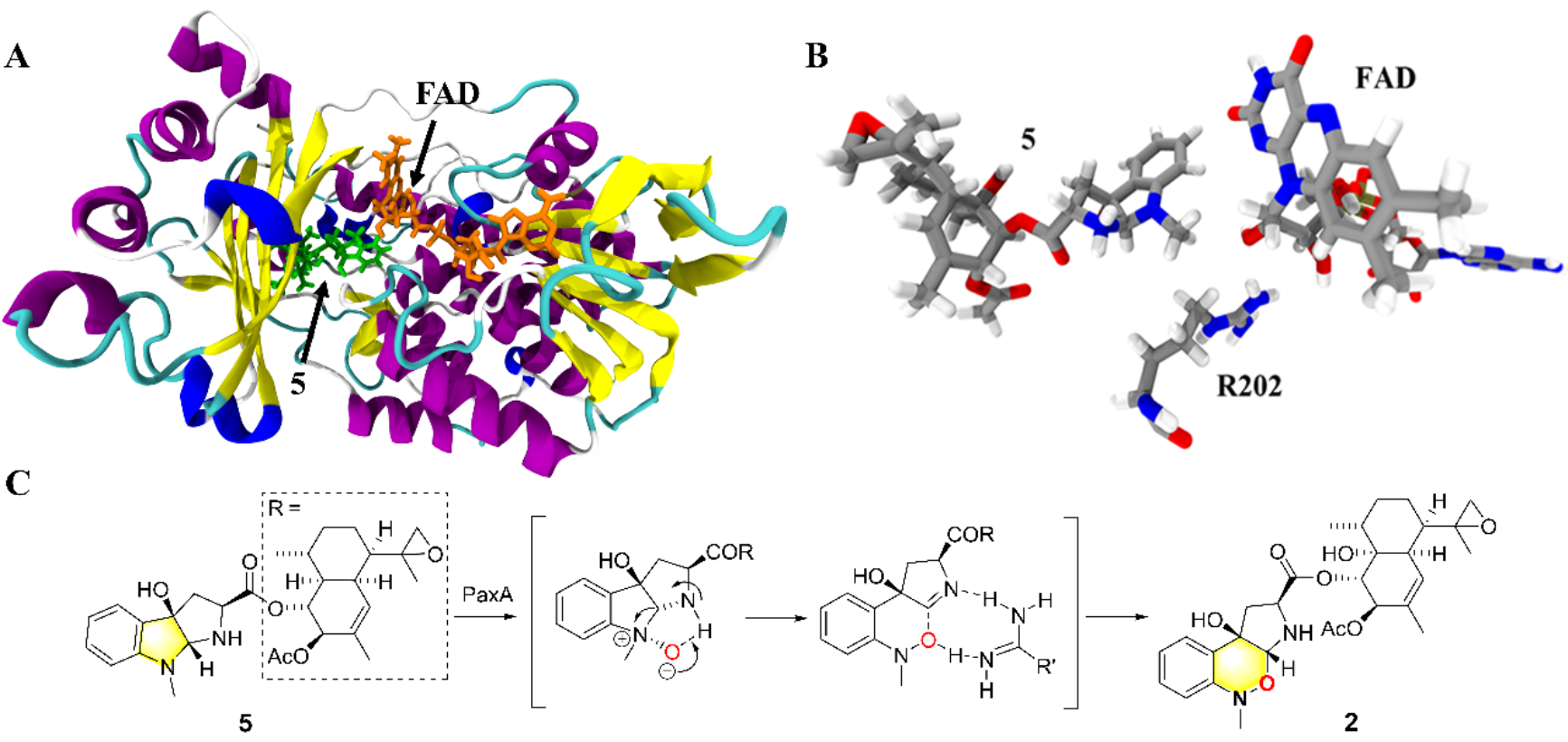 圖:A.PaxA與底物5的分子對接結(jié)果;B.FAD、底物5與R202之間的相對位置;C.PaxA催化1,2-噁嗪環(huán)的酶促機制