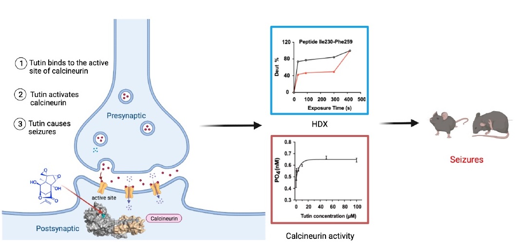 研究團隊長期聚焦于有毒天然產物的研究,在此研究中團隊首次使用熱蛋白質組分析法(Thermal protein profiling, TPP),在原代培養(yǎng)神經元上發(fā)現(xiàn)鈣調神經磷酸酶(Calcineurin, CN)是羥基馬桑毒素致癲癇的關鍵靶標蛋白,并通過多種分子生物學和生物物理實驗技術證實羥基馬桑毒素與CN催化亞基的活性位點結合。研究結果顯示羥基馬桑毒素在體內外實驗中均可激活CN。行為學和腦電結果表明,抑制CN可降低癲癇發(fā)作強度,而且能顯著減輕致癲癇過程中的小鼠皮層和海馬神經元損傷。此外,機制研究發(fā)現(xiàn)NMDA受體、GABA受體和BK通道可能也參與了羥基馬桑毒素致癲癇的過程。該論文充分揭示了羥基馬桑毒素作用機制和靶點,不僅為闡明癲癇發(fā)病機制提供了新的思路,而且為開發(fā)新型治療癲癇藥物提供了新的潛在靶標。
