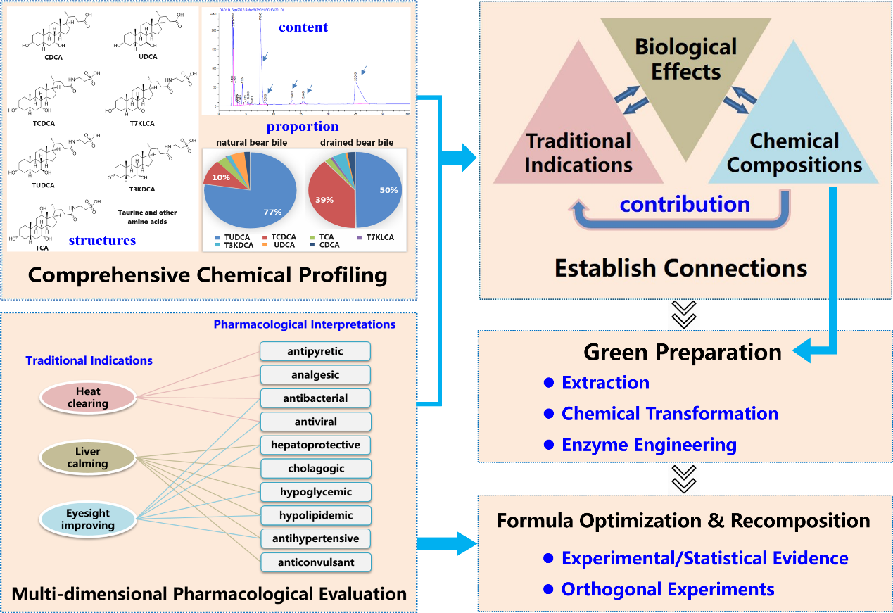近13個世紀以來,熊膽一直是中醫(yī)藥中珍貴而有效的藥材。然而,目前通過養(yǎng)熊活體取膽汁的做法因其對動物福利的不良影響而廣受批評。研究熊膽替代品面臨熊膽的傳統(tǒng)功效描述與現(xiàn)代醫(yī)學術語的壁壘;功效與化學組成之間的關系不清晰;藥效物質的高效、綠色制造以及科學的組方重組等諸多科學挑戰(zhàn)。在這項研究中,作者提出了一套新的研究策略,系統(tǒng)闡釋熊膽傳統(tǒng)療效的科學內涵,整合不同學科的技術來創(chuàng)制人工熊膽。通過建立反映熊膽功效的多維度藥效評價體系,得以全面評價熊膽的治療效果,確定熊膽中的成分哪些是藥效物質;利用化學合成和酶工程技術,實現(xiàn)以高效、環(huán)境友好的方式批量生產熊膽中的藥效物質;基于正交實驗和統(tǒng)計證據對人工熊膽配方進行合理優(yōu)化和重組。