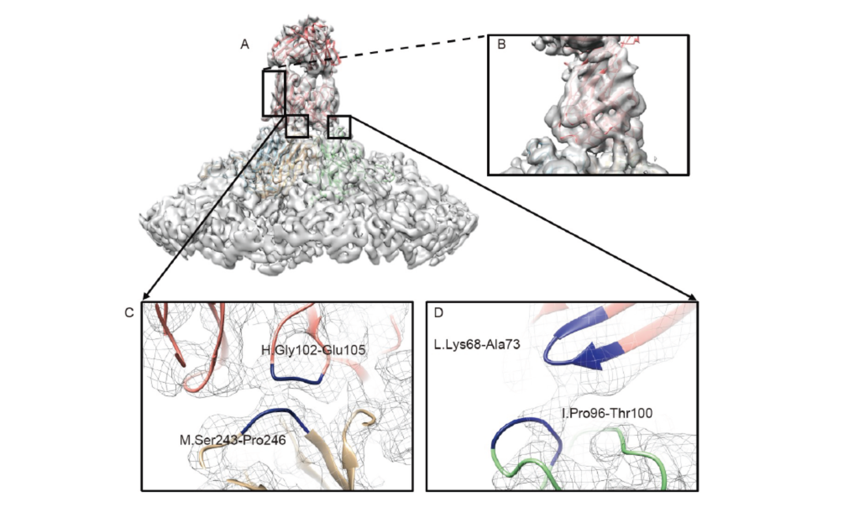 本研究團隊通過采集手足口病人的外周血淋巴細胞,提取抗體基因,構建了人源抗EV-A71病毒噬菌體抗體庫,并篩選獲得了人源抗EV-A71病毒抗體E1。在體外的中和實驗和小鼠的體內(nèi)攻毒實驗中,E1展示了良好的中和活性,并在預防和治療實驗中均完全保護了病毒對小鼠的攻擊。研究團隊通過冷凍電鏡技術解析了抗體和病毒的復合物結構,在4.3 ?水平上清晰展示了人源中和抗體E1和EV-A71病毒的結合。E1識別EV-A71病毒VP1蛋白的BC環(huán)和HI環(huán)中的殘基形成的表位,并在受體阻斷實驗中,顯示E1可以阻斷EV-A71病毒和受體的結合。進一步闡明了抗體中和病毒的機制,為EV-A71病毒的抗體藥物開發(fā)奠定了基礎。