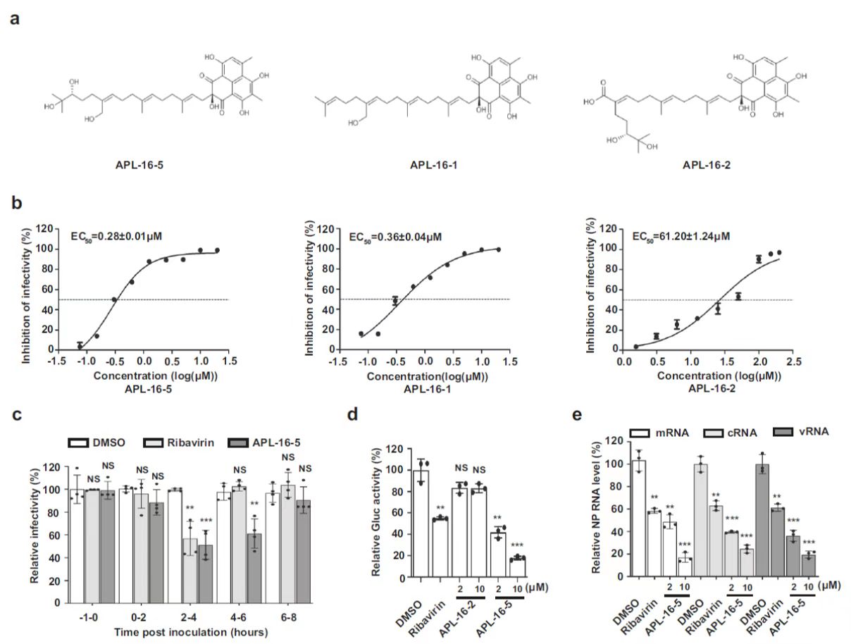 PROTAC技術(shù)是目前藥物研發(fā)領(lǐng)域的熱點(diǎn)方向,在克服耐藥和靶向不可成藥靶點(diǎn)等方面展現(xiàn)出了巨大的潛力。發(fā)現(xiàn)新的可利用的E3泛素連接酶并開發(fā)相應(yīng)的PROTAC具有重要科學(xué)意義和應(yīng)用價(jià)值。該研究團(tuán)隊(duì)發(fā)現(xiàn)了第一個(gè)來源于微生物天然產(chǎn)物的PROTAC,表明微生物代謝產(chǎn)物可成為其重要來源。微生物天然產(chǎn)物APL-16-5是由國家菌種資源庫中國藥學(xué)微生物菌種保藏管理中心自行分離的植物內(nèi)生菌Aspergillus sp. CPCC 400735產(chǎn)生。該研究發(fā)現(xiàn)APL-16-5同時(shí)結(jié)合E3泛素連接酶TRIM25和流感病毒PA亞基,基于蛋白降解靶向嵌合體(proteolysis-targeting chimeras,PROTAC)機(jī)制,誘導(dǎo)TRIM25依賴的 PA泛素化及其降解,阻斷病毒RNA復(fù)制,具有良好的體內(nèi)抗甲型流感病毒活性。