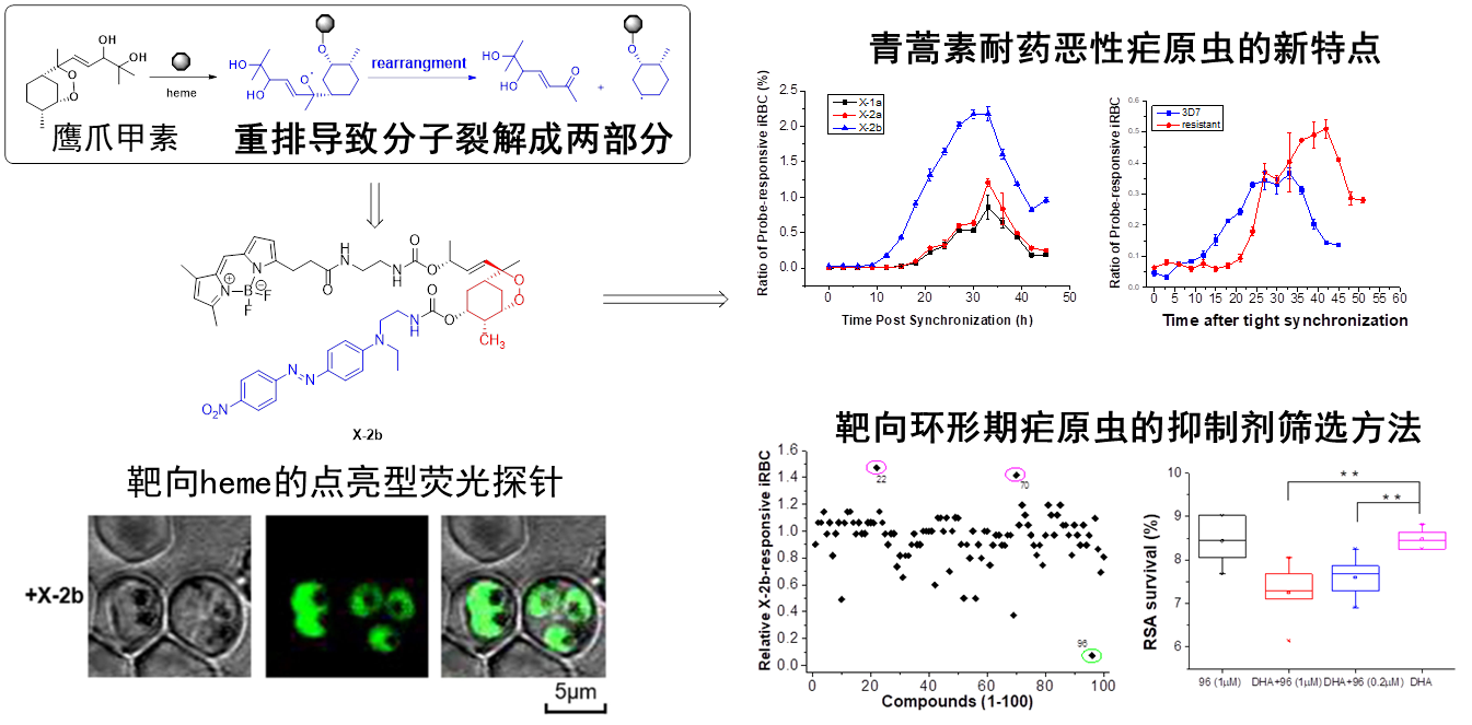作為寄生蟲的惡性瘧原蟲入侵人體紅細胞后水解大量的血紅蛋白以釋放自身生長所需的氨基酸,這一過程也釋放出大量游離的亞鐵血紅素,后者可激活青蒿素而引發(fā)其自由基介導的強效抗瘧作用。因此,亞鐵血紅素可否成為一個可量化的指標來研究惡性瘧的耐藥機制?以此問題為出發(fā)點,本研究團隊基于第一個結構明確的含內(nèi)過氧橋鍵抗瘧天然產(chǎn)物鷹爪甲素與亞鐵血紅素的獨特作用機制,即鷹爪甲素被亞鐵血紅素激活使其分解為兩部分的特征,設計合成了基于鷹爪甲素的亞鐵血紅素激活點亮型小分子熒光探針(X-2b)。該探針可非侵入性地檢測惡性瘧原蟲中的亞鐵血紅素水平,發(fā)現(xiàn)耐青蒿素的惡性瘧原蟲生長周期中亞鐵血紅素的低水平期(環(huán)形期)發(fā)生了明顯的延長(延長了約10小時);同時,研究團隊通過X-2b探針建立了一種靶向環(huán)形期瘧原蟲抑制劑的篩選方法,成功發(fā)現(xiàn)了多個對環(huán)形期瘧原蟲有抑制作用的活性天然產(chǎn)物,其中活性最為顯著的是扁塑藤素,其增加了耐藥惡性瘧對青蒿素的敏感性。研究結果表明基于鷹爪甲素的探針揭示了一個可量化的青蒿素耐藥惡性瘧的表型特征,并可快速篩選靶向環(huán)形期的抑制劑,為青蒿素耐藥的防控和克服帶來了新途徑。