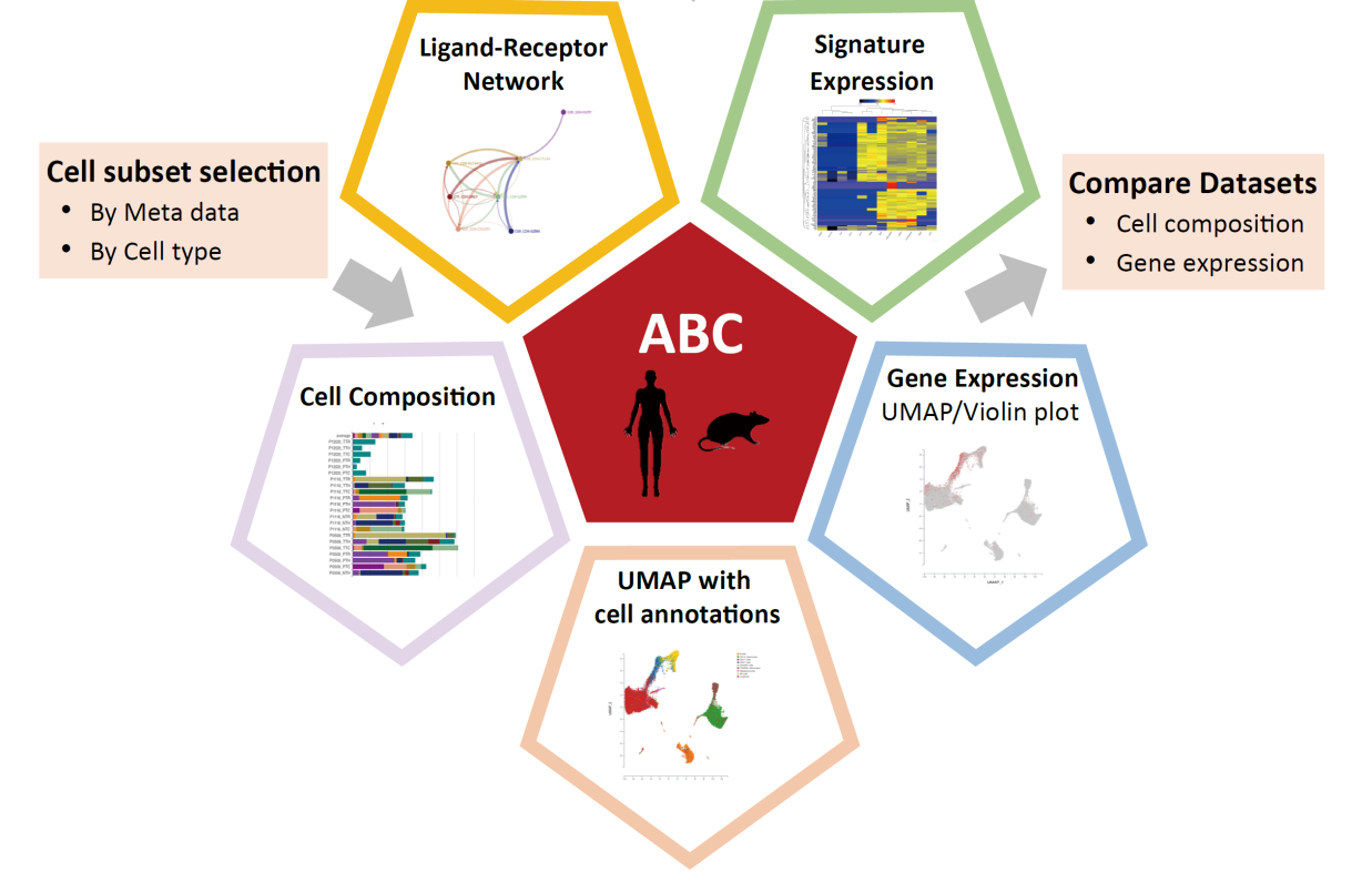 ABC portal提供基于網(wǎng)頁(yè)的交互式分析模塊,提供基因表達(dá)、細(xì)胞比例、細(xì)胞相互作用和疾病相關(guān)的基因特征分析。特別是,ABC portal支持基于樣本信息的個(gè)性化的樣本篩選,細(xì)胞類(lèi)型篩選,并對(duì)篩選后的數(shù)據(jù)進(jìn)行進(jìn)一步分析;支持跨數(shù)據(jù)集的比較分析。交互設(shè)計(jì)簡(jiǎn)潔易操作,分析內(nèi)容多樣,并且可以設(shè)置個(gè)性化參數(shù)以滿足不同的數(shù)據(jù)分析目的。ABC portal為血液和免疫學(xué)研究者提供了一個(gè)對(duì)海量單細(xì)胞數(shù)據(jù)進(jìn)行交互式探索和再分析的數(shù)據(jù)庫(kù),為血液生理和血液疾病的研究提供了豐富的數(shù)據(jù)資源和工具。