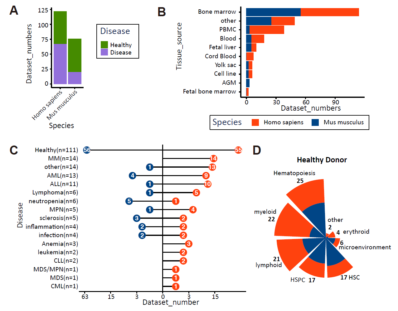 ABC portal 數(shù)據(jù)庫(kù) (http://abc.sklehabc.com) 是ABC研究計(jì)劃的重要組成部分,共計(jì)收錄了國(guó)際上公開(kāi)發(fā)表的198套人和小鼠的血液/免疫相關(guān)的單細(xì)胞轉(zhuǎn)錄組數(shù)據(jù)集,涉及文獻(xiàn)150篇,其中國(guó)內(nèi)研究工作的貢獻(xiàn)率占比高達(dá)11%。該數(shù)據(jù)庫(kù)涵蓋了血液/免疫細(xì)胞的發(fā)育、分化和疾病相關(guān)的大量數(shù)據(jù),數(shù)據(jù)來(lái)源覆蓋了骨髓、外周血、胎肝等各種造血組織。為了方便用戶對(duì)數(shù)據(jù)進(jìn)行探索分析,所有數(shù)據(jù)都使用人工矯正后的單細(xì)胞參考數(shù)據(jù)進(jìn)行了統(tǒng)一注釋。