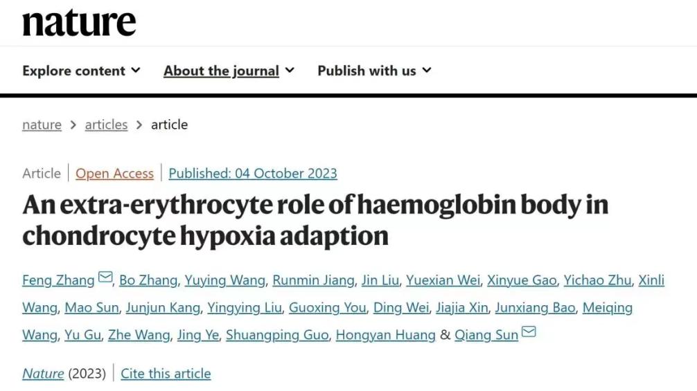 2023年10月4日,中國醫(yī)學科學院細胞死亡機制創(chuàng)新單元在《自然》在線發(fā)表了題為“An extra-erythrocyte role of haemoglobin body in chondrocyte hypoxia adaption”的論文。研究首次報道了軟骨細胞在缺氧時產(chǎn)生大量血紅蛋白,且在細胞質(zhì)內(nèi)形成無膜的血紅蛋白小體(Hemoglobin Body, Hedy);在缺氧加劇的情況下,血紅蛋白小體釋放儲存的氧氣,以維持軟骨細胞的存活和生長板的發(fā)育。