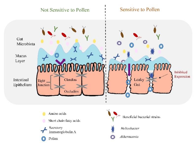 本研究團(tuán)隊(duì)從腸道菌入手,采用非靶向代謝組學(xué)結(jié)合微生物組學(xué)方法,尋找發(fā)生花粉過敏可能的分子機(jī)制。研究發(fā)現(xiàn),過敏組大鼠血中纈氨酸、異亮氨酸、天冬氨酸、谷氨酸、谷氨酰胺、丙酸吲哚(IPA)和肌醇含量顯著降低,而糞便中短鏈脂肪酸(SCFAs)減少。腸道菌產(chǎn)生的小分子代謝物BCAAs/IPA/SCFAs和特征菌Helicobacter pylori /Akkermansia muciniphila可能通過抑制Claudin蛋白表達(dá)和影響粘液層而破壞腸道屏障功能,使免疫功能受損和病原體敏感性增加,進(jìn)而導(dǎo)致花粉過敏。這些發(fā)現(xiàn)不僅為微生物在花粉過敏發(fā)生過程中的作用提供了重要信息,而且提示逆轉(zhuǎn)腸道滲漏可能是預(yù)防和干預(yù)花粉過敏的有效策略。