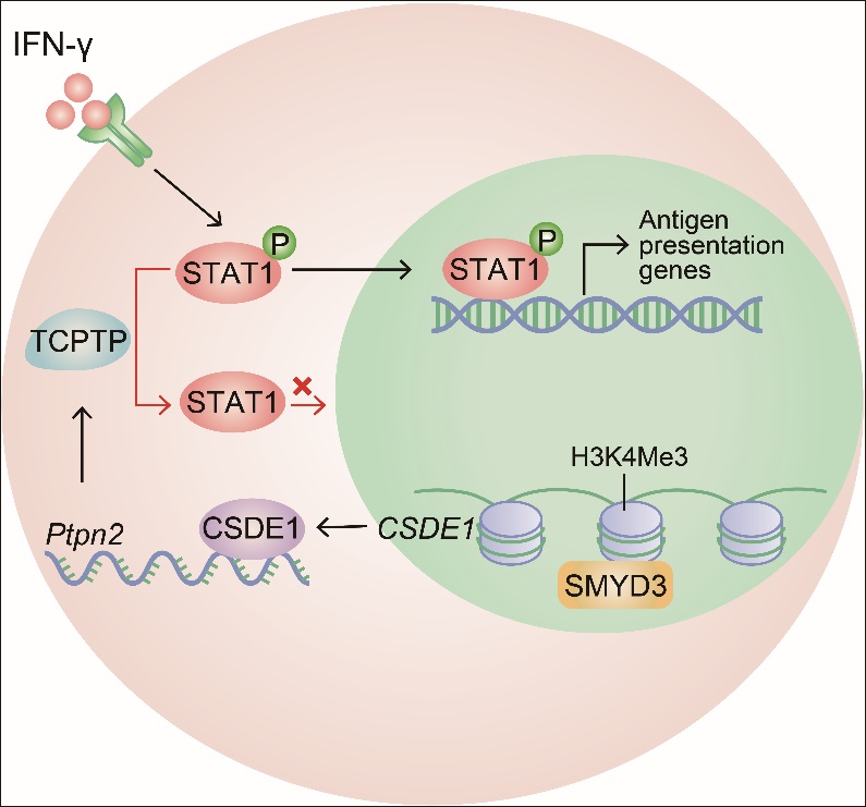腫瘤種子細胞,亦稱為腫瘤干細胞,是非常少的一群具有自我更新能力的關鍵腫瘤細胞,具有極強的成瘤性,是腫瘤發(fā)生的根源。本研究團隊前期利用生物機械力學的原理,建立了軟的三維纖維蛋白凝膠(Soft 3D fibrin gel)培養(yǎng)系統(tǒng),能夠在體外篩選、擴增腫瘤種子細胞,而在體內接種 5個細胞即可在免疫正常的小鼠體內成瘤。在本研究中,該團隊成功地接種一個腫瘤種子細胞,使其能夠在免疫正常小鼠體內長出腫瘤。利用該手段,團隊發(fā)現(xiàn)單個腫瘤種子細胞,盡管在免疫缺陷的小鼠均可成瘤,但在免疫正常的小鼠體內只有一部分成瘤,一部分不成瘤。這表明腫瘤種子細胞成瘤的能力相似,但受免疫識別和監(jiān)視的特性卻存在差別。研究還發(fā)現(xiàn),這些最終能發(fā)展成為腫瘤的種子細胞均高表達一種稱之為CSDE1的RNA結合蛋白。進一步的分子機制探究揭示,原始的腫瘤種子細胞在早期擴增階段,受微環(huán)境的生物機械力的作用,出現(xiàn)了表觀遺傳修飾的差異,導致一部分腫瘤種子細胞高表達CSDE1,而另一部分則低表達該蛋白;CSDE1通過穩(wěn)定一種磷酸水解酶PTPN2的mRNA而上調其表達,PTPN2識別磷酸化的酪氨酸位點,從而使STAT1去磷酸化而失活?;罨?/span>STAT1是啟動抗腫瘤免疫的關鍵信號,其能夠使腫瘤細胞高表達腫瘤抗原,促進CD8+ T細胞識別和殺傷。因此,一旦STAT1分子失活,腫瘤種子細胞獲得了腫瘤免疫逃逸的表型,進而逃避免疫攻擊,最終發(fā)展成為具有臨床癥狀的腫瘤。
