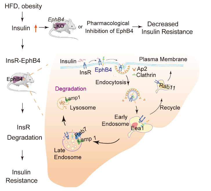 本研究團(tuán)隊(duì)首次發(fā)現(xiàn)EphB4能夠直接與胰島素受體(InsR)形成相互作用;生理和病理濃度的胰島素均增加EphB4與InsR 的相互作用;在肝細(xì)胞中,EphB4 通過(guò)其Ap2 結(jié)合位點(diǎn)進(jìn)而介導(dǎo)胰島素受體內(nèi)吞并經(jīng)溶酶體途徑降解;在小鼠肝組織中,敲除EphB4能夠有效改善飲食誘導(dǎo)或遺傳因素導(dǎo)致的肥胖小鼠模型的胰島素抵抗?fàn)顟B(tài);在糖尿病模型 db/db小鼠中,慢病毒shRNA敲低EphB4或給予EphB4抑制劑均明顯增強(qiáng)動(dòng)物的胰島素敏感性,改善肥胖小鼠的葡萄糖穩(wěn)態(tài)。本研究揭示了胰島素促進(jìn)胰島素受體降解這一生物學(xué)過(guò)程的新機(jī)制,亦為胰島素抵抗和2型糖尿病的治療提供潛在新藥靶。