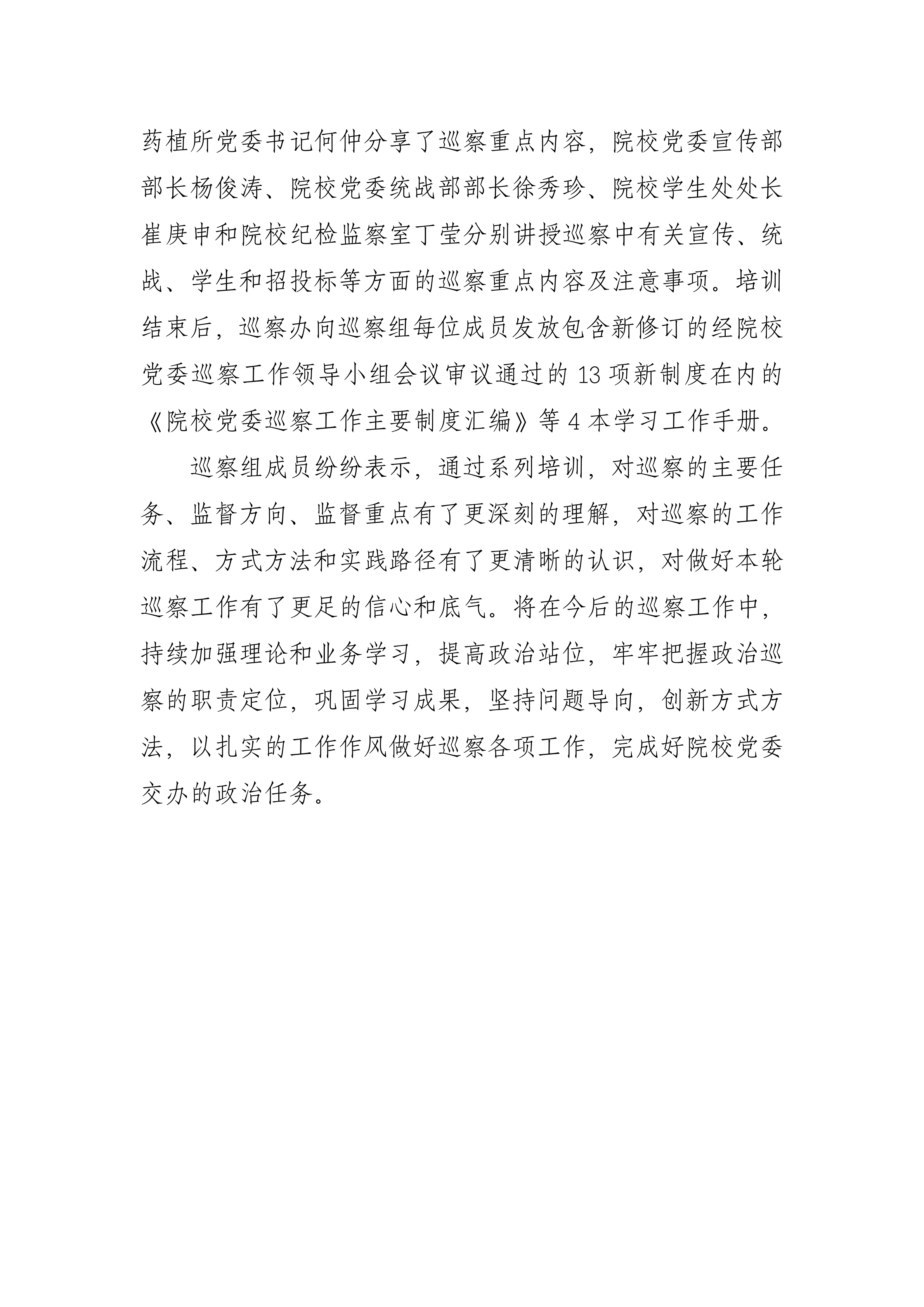 培訓(xùn)中,院校黨委二十大后首輪巡察第一巡察組組長(zhǎng)、藥植所黨委書記何仲分享了巡察重點(diǎn)內(nèi)容,院校黨委宣傳部部長(zhǎng)楊俊濤、院校黨委統(tǒng)戰(zhàn)部部長(zhǎng)徐秀珍、院校學(xué)生處處長(zhǎng)崔庚申和院校紀(jì)檢監(jiān)察室丁瑩分別講授巡察中有關(guān)宣傳、統(tǒng)戰(zhàn)、學(xué)生和招投標(biāo)等方面的巡察重點(diǎn)內(nèi)容及注意事項(xiàng)。培訓(xùn)結(jié)束后,巡察辦向巡察組每位成員發(fā)放包含新修訂的經(jīng)院校黨委巡察工作領(lǐng)導(dǎo)小組會(huì)議審議通過的13項(xiàng)新制度在內(nèi)的《院校黨委巡察工作主要制度匯編》等4本學(xué)習(xí)工作手冊(cè)。
