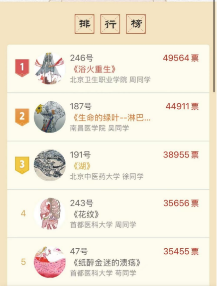 本次大賽設(shè)置人氣獎(jiǎng)評(píng)選環(huán)節(jié),共有百萬(wàn)余人次參與線上投票,瀏覽量達(dá)224萬(wàn)次。經(jīng)過(guò)激烈角逐,最終5幅作品獲得“最佳人氣獎(jiǎng)”。北京衛(wèi)生職業(yè)學(xué)院周子暉的作品《浴火重生》獲得49564票,榮獲“最佳人氣獎(jiǎng)”第一名。