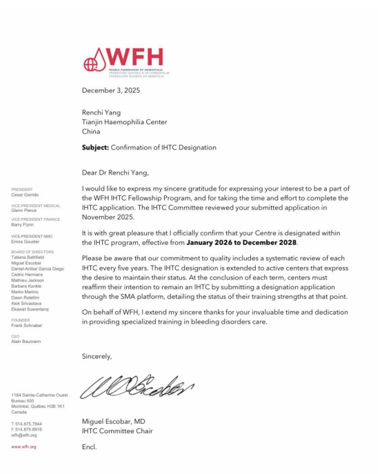 2025年12月3日,血液病醫(yī)院血栓止血診療中心/天津血友病中心正式通過世界血友病聯(lián)盟(WFH)審核,被認(rèn)證為國際血友病培訓(xùn)中心(International Hemophilia Training Centre,IHTC),并加入IHTC獎(jiǎng)學(xué)金項(xiàng)目。此次認(rèn)證是對(duì)血液病醫(yī)院血栓止血診療中心(以下簡稱“中心”)近四十年來在血友病防治、科研、培訓(xùn)和體系建設(shè)方面卓越成就的充分肯定,也標(biāo)志著中國將在全球血友病防治事業(yè)中承擔(dān)更重要的角色,最終惠及廣大以血友病為代表的出血性疾病患者。