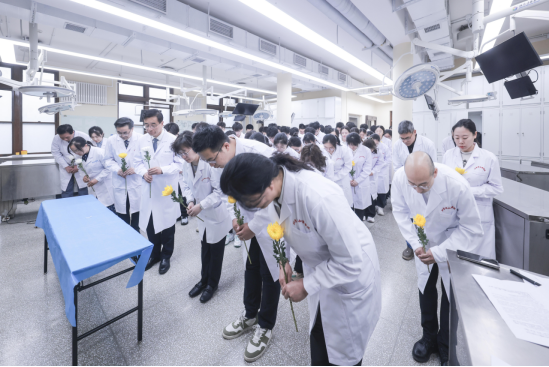 參加開課儀式的全體師生向我校首位遺體志愿捐獻者顧頡剛先生的骨骼、及所有大體老師三鞠躬并靜思,表達對逝者的深切緬懷與崇高敬意。