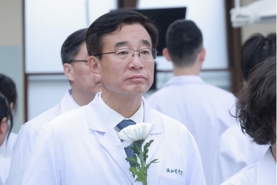 院校長王辰院士,院校黨委書記鄧海華,黨委副書記張勤,基礎(chǔ)學(xué)院黨委書記王婧,醫(yī)學(xué)教育研究中心主任歸航、副主任唐琳,兩位班主任、院校團委書記尹嘉男和臨床學(xué)院外科學(xué)系馬琳,以及人體解剖與組胚學(xué)系全體老師和2022級八年制醫(yī)學(xué)專業(yè)全體同學(xué)參加開課儀式。教務(wù)處長、人體解剖與組胚學(xué)系主任馬超主持儀式。在儀式的開始,老師們?yōu)橥瑢W(xué)們送上了象征醫(yī)學(xué)生身份的白大衣,這更是一份責(zé)任與使命的神圣寄托,激勵同學(xué)們朝著成為真正白衣天使的目標(biāo)努力。