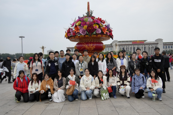同學(xué)們滿懷著激動的心情,揮舞著手中的國旗,在天安門廣場的巨大花籃前合影留念。