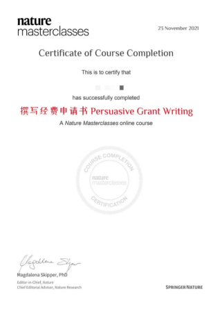 學(xué)員完成每項(xiàng)課程后,可下載學(xué)習(xí)證書,作為接受過相關(guān)培訓(xùn)的證明,證書由《自然》總編輯Magdalena Skipper簽發(fā)。